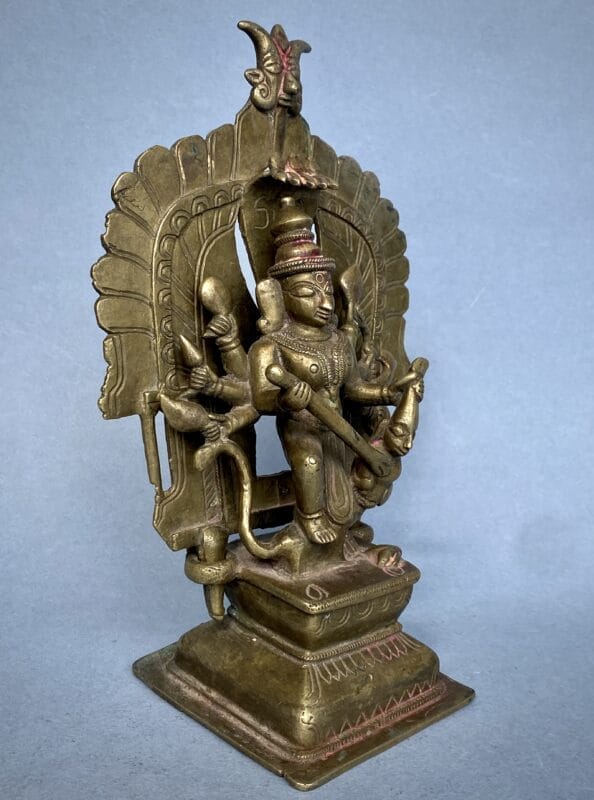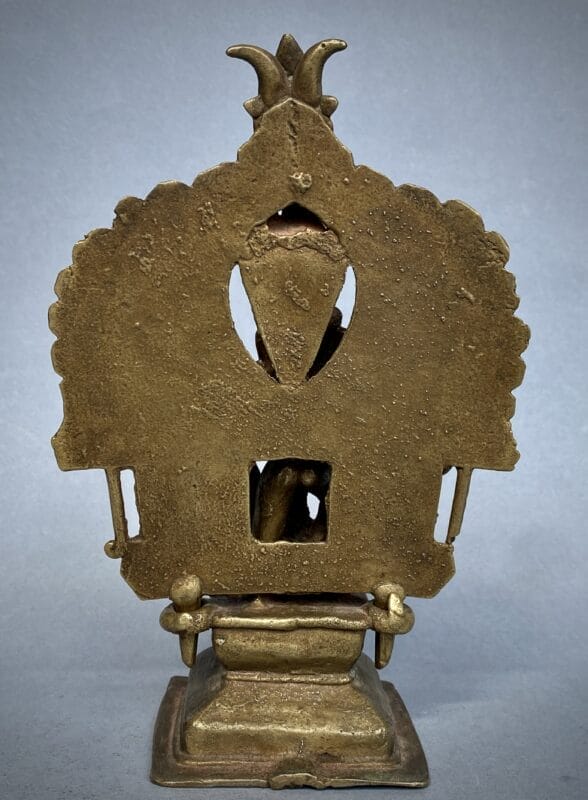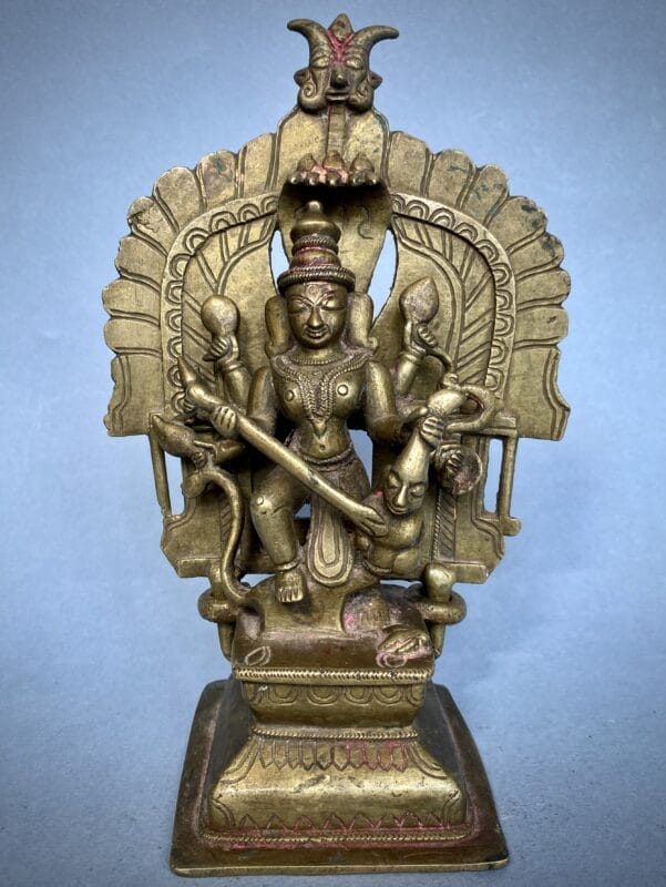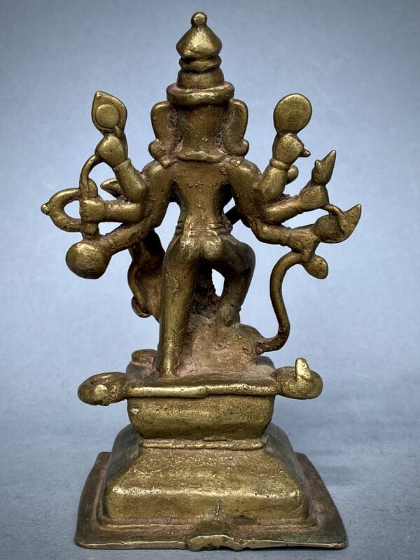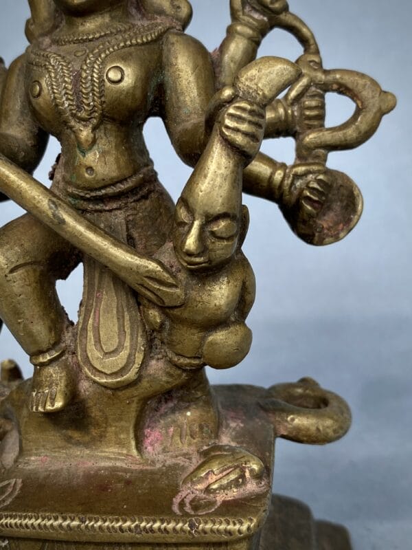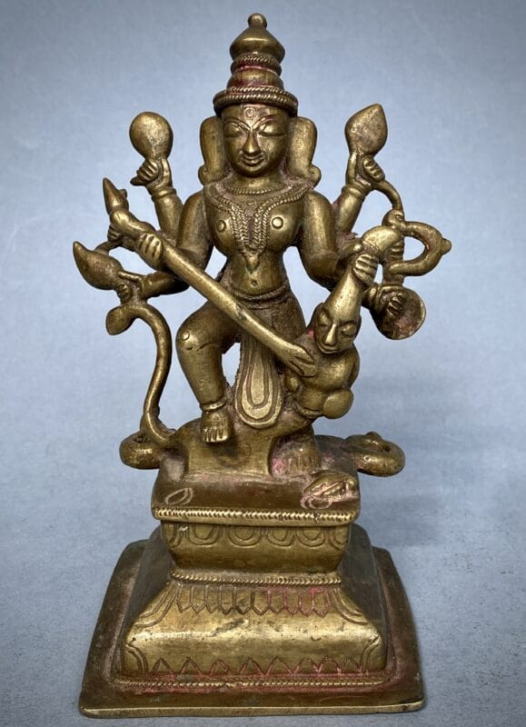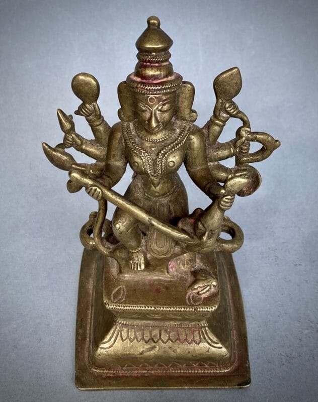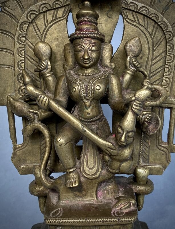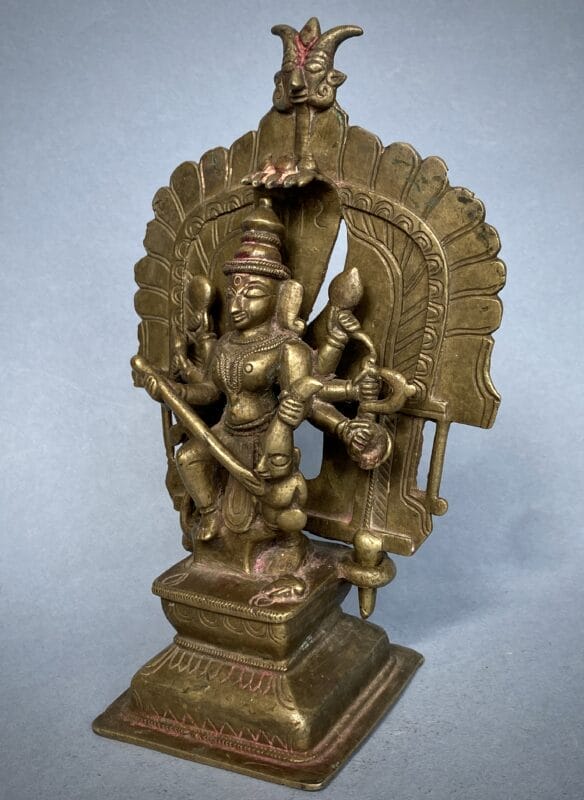 Bronzo devozionale fuso a ‘cire perdue’ con aureola ad arco (prabhāvali) sormontata da kīrtimukha e piccolo cappuccio di nāga; la Dea campeggia in assetto di battaglia, a otto braccia (aṣṭa-bhuja), con il ginocchio sinistro flesso e il piede destro saldo sul basamento. Il lungo śūla attraversa in diagonale la scena e trafigge il demone che emerge in forma umana dal collo del bufalo: la testa recisa dell’animale è ben visibile, poggiata sul plinto frontale, mentre il corpo taurino giace sotto la gamba della Divinità. Altri attributi — tra cui mazze/loto, cappio e piccolo scudo a disco, con serpenti modellati sul piede del basamento e avvolti alla spalliera — completano l’iconografia del mito; tracce di polvere rossa rituale (kumkum) permangono in più punti, insieme a lucidature d’uso sui rilievi, indizio di lunga frequentazione votiva. La base a più ordini reca decorazioni punzonate e bordi a cordoncino; la prabhāvali è un elemento separato, bloccato con perni, secondo pratica tipica delle officine devozionali dell’India occidentale. L’impianto stilistico — volto ovale con occhi incisi, alto jaṭā-mukuṭa conico, repertorio ornamentale semplificato — consente un’attribuzione al XIX secolo in area deccanese o maharashtriana.