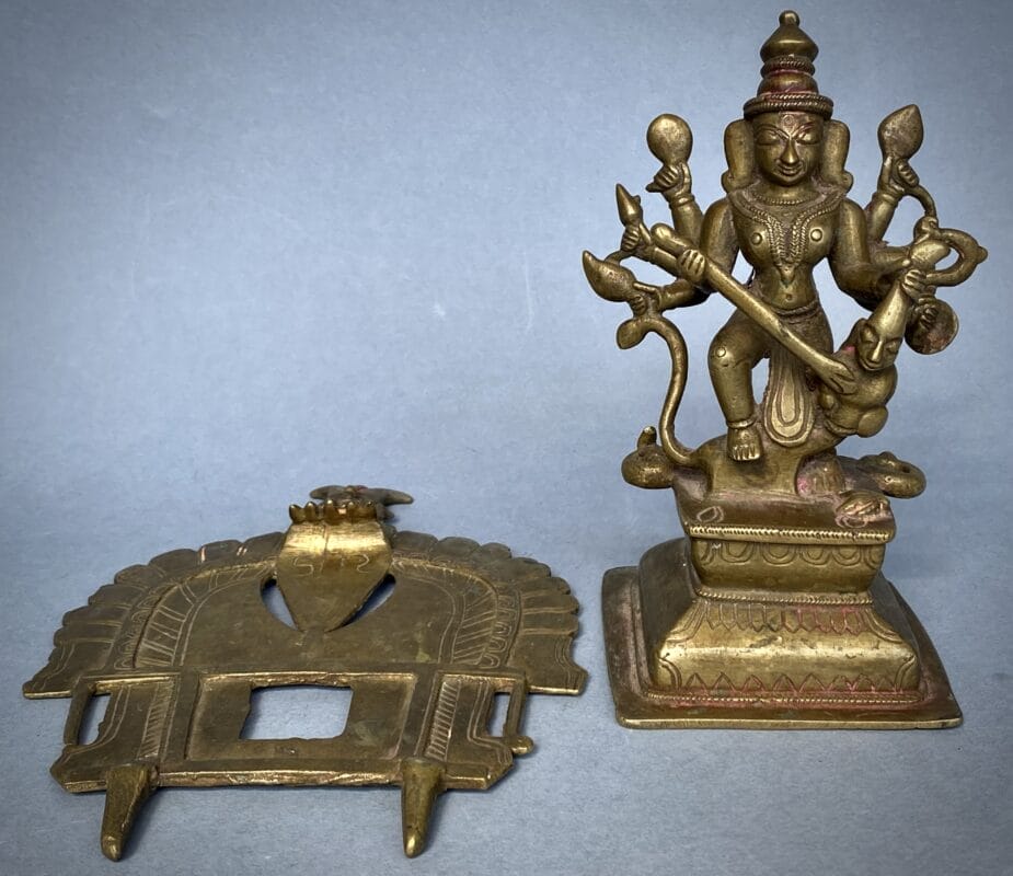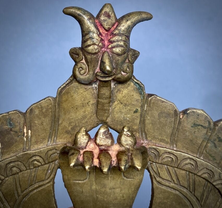 Sotto il profilo religioso il soggetto appartiene pienamente al gusto śivaita: Mahiṣāsuramardinī è l’aspetto guerriero di Durgā/Pārvatī, Śakti di Śiva, la cui energia ristabilisce l’ordine cosmico sconfiggendo Mahiṣa, come narrato nel Devī-Māhātmya. La presenza di kīrtimukha in sommità (emblema apotropaico frequente nei santuari śaiva), dei nāga, e i residui di unzione e polveri sacre alludono al contesto di culto domestico e alle festività della Dea (Navarātri), rendendo questo esemplare particolarmente eloquente anche per storia d’uso.