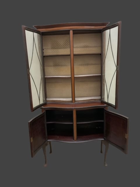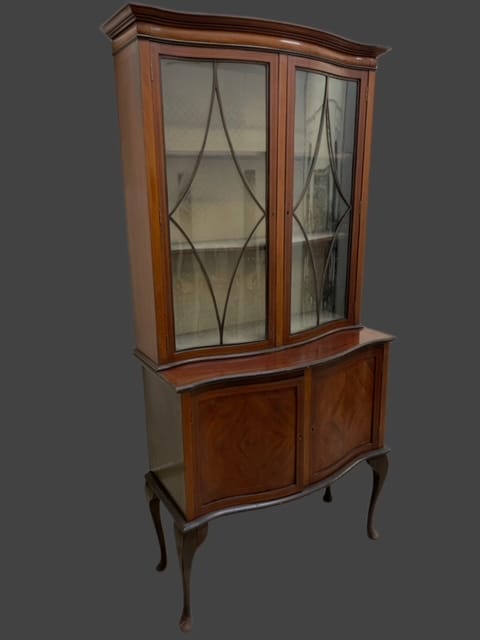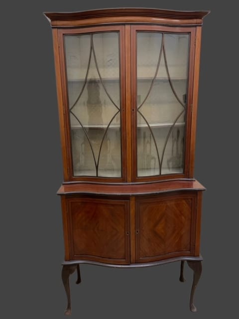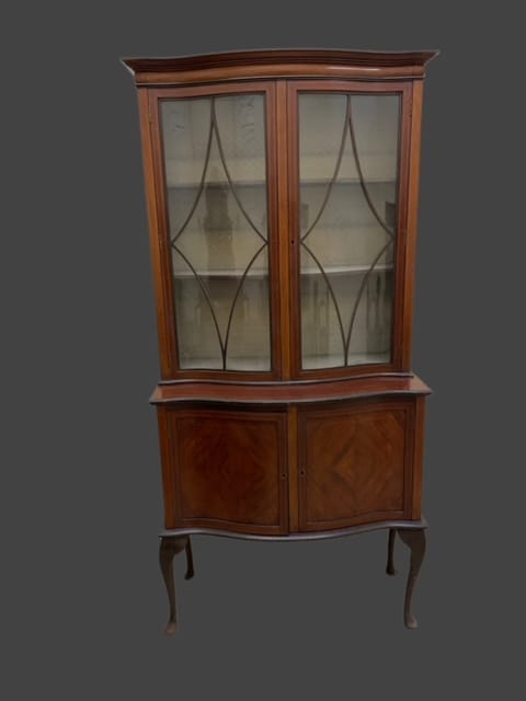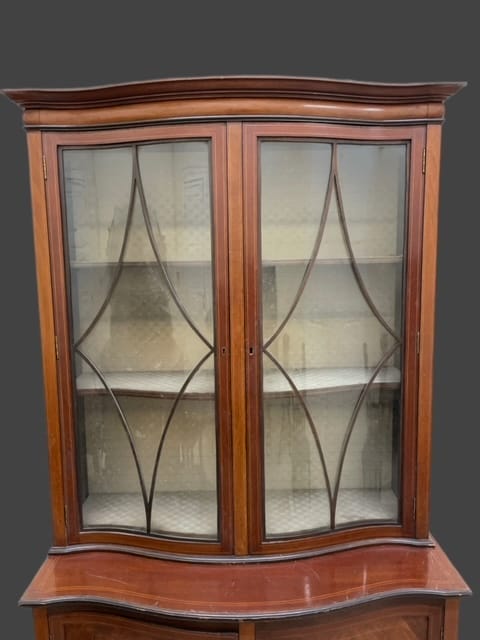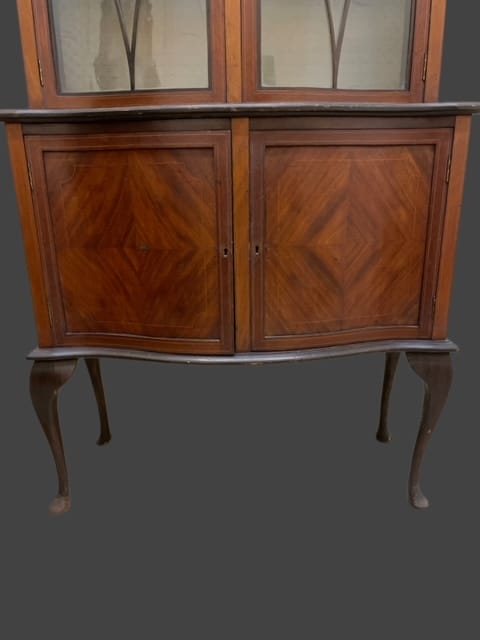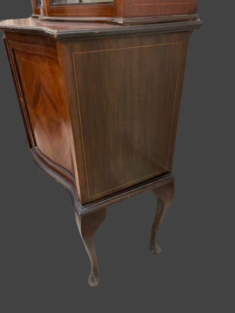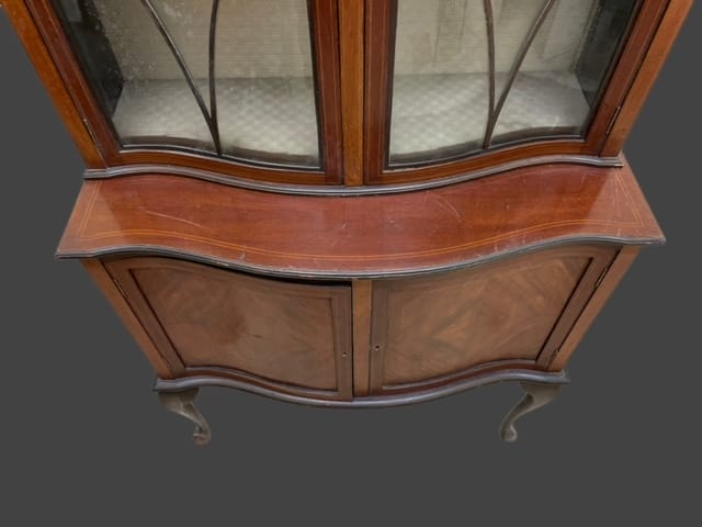 Mobile credenza con vetrina, in mogano con intarsi in legno chiaro. Fronte mosso e piedini alti ricurvi.