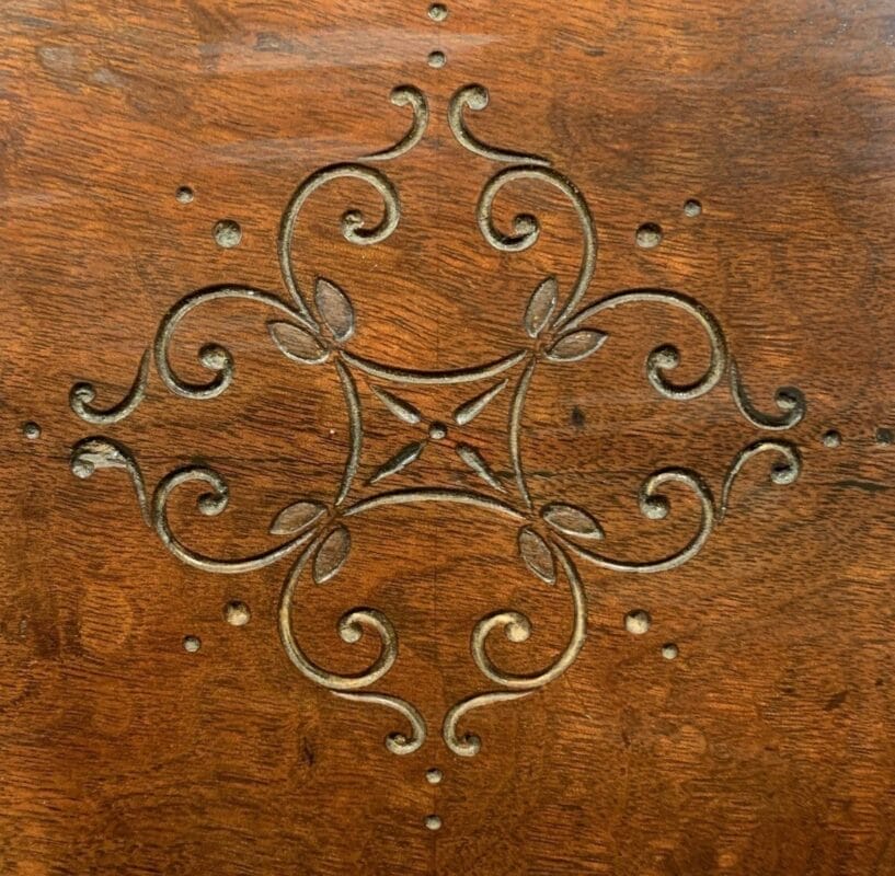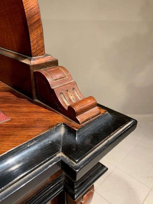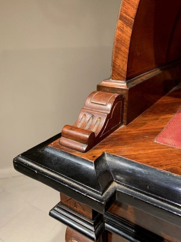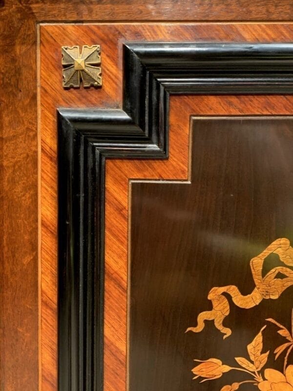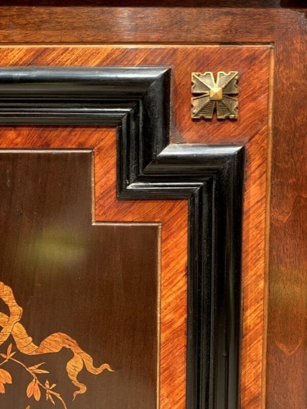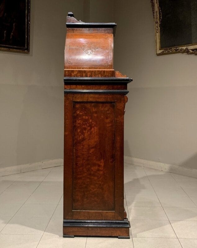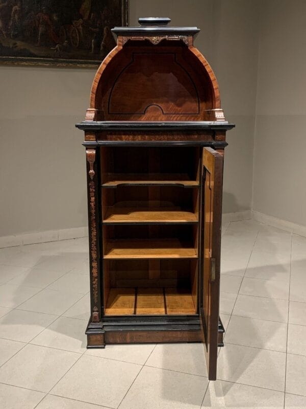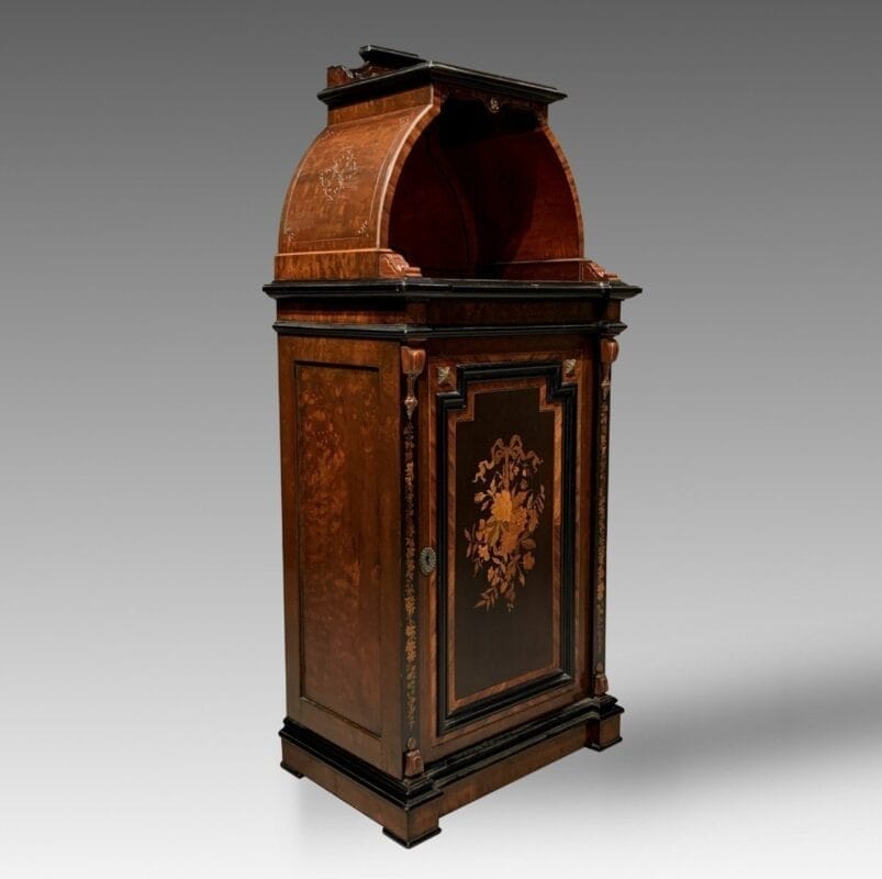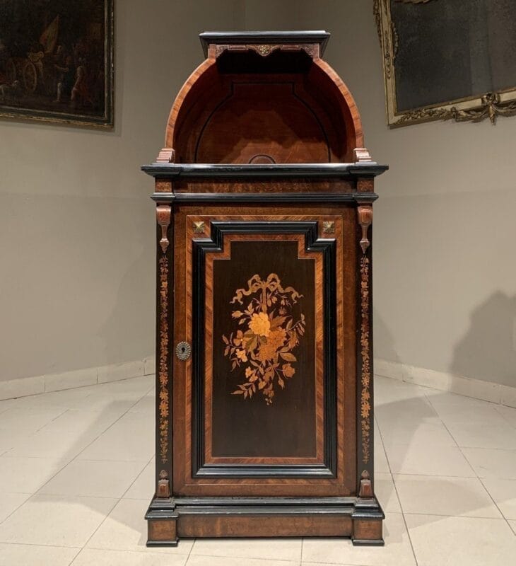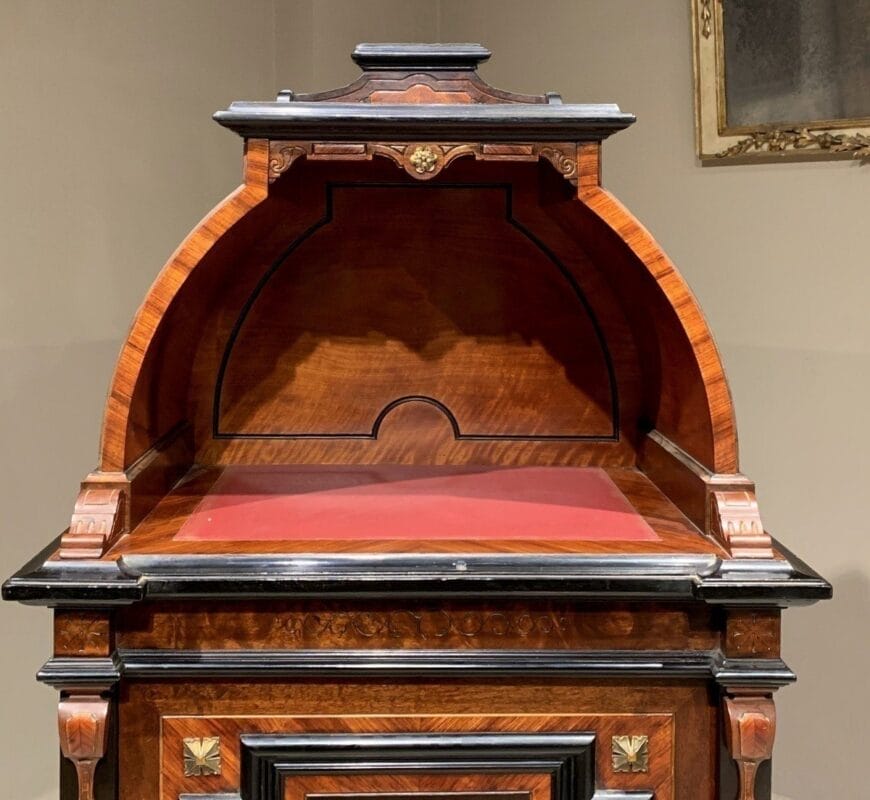 Antico e raro mobile con anta centrale e nicchia soprastante, elegantemente impiallacciato e intarsiato in essenze varie, interni in acero e rivestito con un piano in pelle, Francia, epoca Napolèon III.