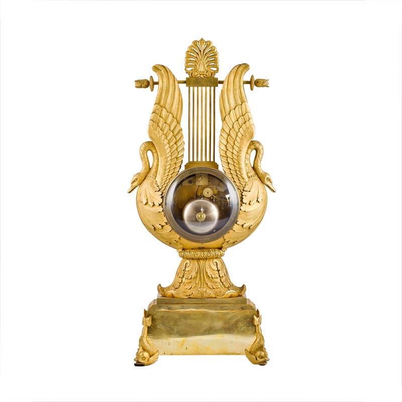 Base rettangolare indossata agli angoli dai delfini, in rilievo modellatura con foglie d’acqua del tallone cesellate; sormontato da una grande lira la cui base è formata da una grande base di foglie di acanto, e il corpo da due cigni appoggiati alle ali si allargano verticalmente, incorniciando con il loro corpo il movimento, il cui cadtan cesellato dorato reca le ore incise sulle palline d’argento circondate da corona d’alloro cesellata; il centro bassorilievo Nettuno su un delfino e che tiene una lira, lunetta zigrinata con vetro. Tra le ali e i cigni si ergono i nuclei della lira sormontati da una palmetta.