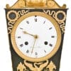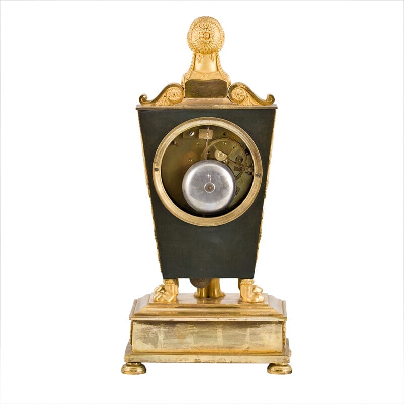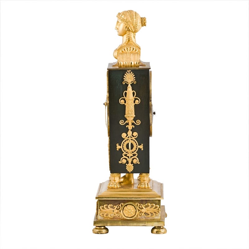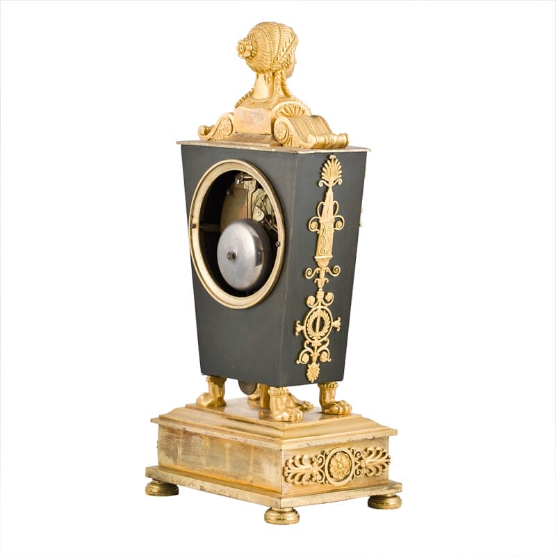 Strepitoso Orologio da tavolo, Impero, della prima metà del XIX secolo e provenienza francese. Quadrante firmato “Jearmin à Paris”. Il design di quest’orologio è composto dalla cassa che presenta una forma trapezoidale rovesciata, con una base più stretta in alto e più larga in basso. Mentre Il corpo dell’orologio è decorato con motivi dorati in bronzo dorato che contrastano con il fondo scuro, in bronzo brunito. La base è ampia, rettangolare, con piedini tondi e decorazioni a rilievo in bronzo dorato, con motivi floreali e rosette. Sulla sommità dell’orologio è presente un busto femminile in bronzo dorato (probabilmente una sfinge), con capelli intrecciati e abiti tipici dell’antichità. Sotto il quadrante, troviamo un’aquila ad ali spiegate (simbolo imperiale napoleonico), affiancata da cornucopie e motivi floreali. I lati del corpo presentano decorazioni verticali in rilievo con motivi floreali e strumenti musicali stilizzati, molto comuni nello stile Impero. Il quadrante è in smalto bianco ed è firmato “Jearmin à Paris”, un orologiaio attivo a Parigi, confermando l’origine francese dell’orologio. Le lancette, finemente lavorate, sono in stile “Breguet” o simile, tipico dei primi dell’Ottocento. Presenta due fori di carica (uno per il meccanismo orario e uno per il suono delle ore), caratteristica degli orologi meccanici a pendolo dell’epoca.