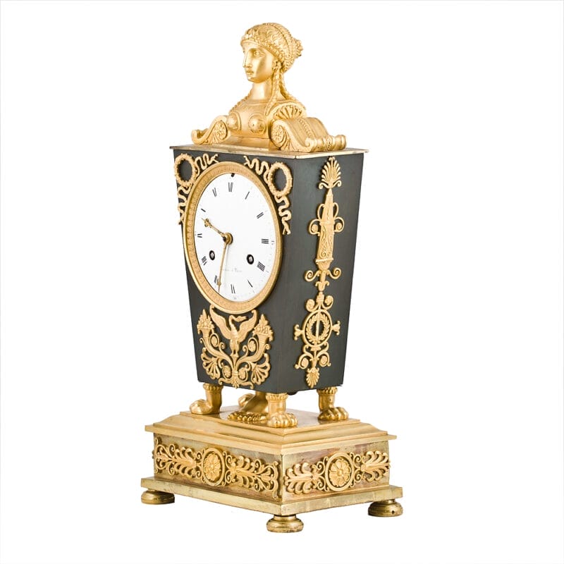 Strepitoso Orologio da tavolo, Impero, della prima metà del XIX secolo e provenienza francese. Quadrante firmato “Jearmin à Paris”. Il design di quest’orologio è composto dalla cassa che presenta una forma trapezoidale rovesciata, con una base più stretta in alto e più larga in basso. Mentre Il corpo dell’orologio è decorato con motivi dorati in bronzo dorato che contrastano con il fondo scuro, in bronzo brunito. La base è ampia, rettangolare, con piedini tondi e decorazioni a rilievo in bronzo dorato, con motivi floreali e rosette. Sulla sommità dell’orologio è presente un busto femminile in bronzo dorato (probabilmente una sfinge), con capelli intrecciati e abiti tipici dell’antichità. Sotto il quadrante, troviamo un’aquila ad ali spiegate (simbolo imperiale napoleonico), affiancata da cornucopie e motivi floreali. I lati del corpo presentano decorazioni verticali in rilievo con motivi floreali e strumenti musicali stilizzati, molto comuni nello stile Impero. Il quadrante è in smalto bianco ed è firmato “Jearmin à Paris”, un orologiaio attivo a Parigi, confermando l’origine francese dell’orologio. Le lancette, finemente lavorate, sono in stile “Breguet” o simile, tipico dei primi dell’Ottocento. Presenta due fori di carica (uno per il meccanismo orario e uno per il suono delle ore), caratteristica degli orologi meccanici a pendolo dell’epoca.