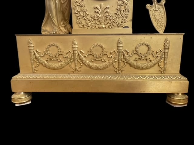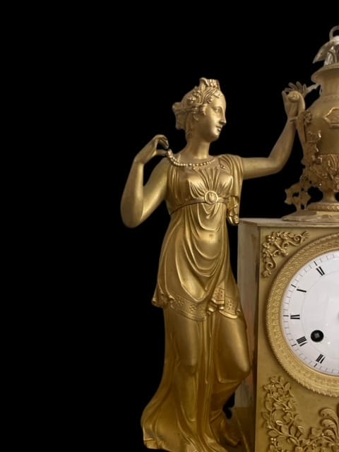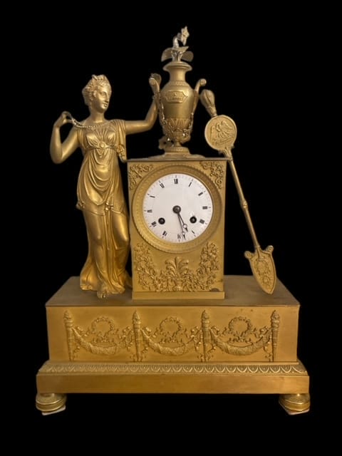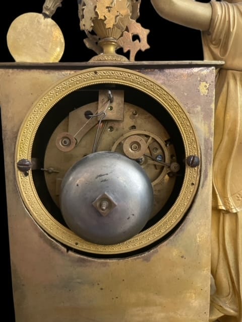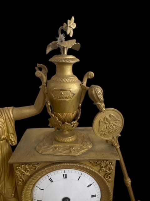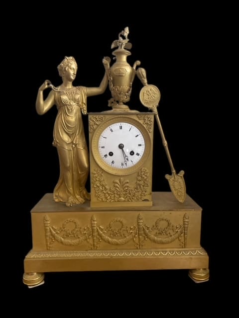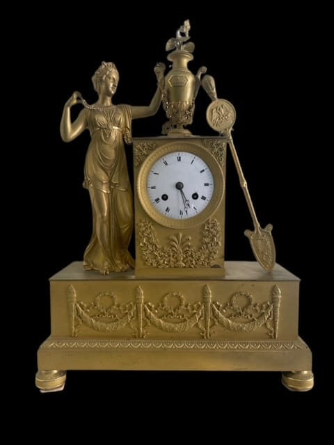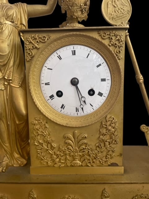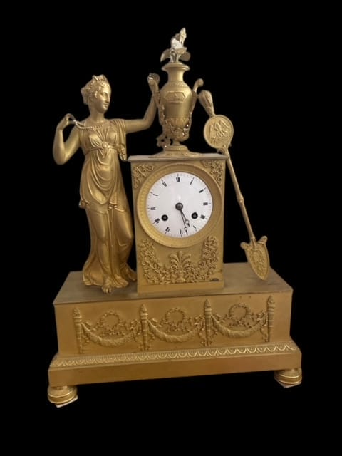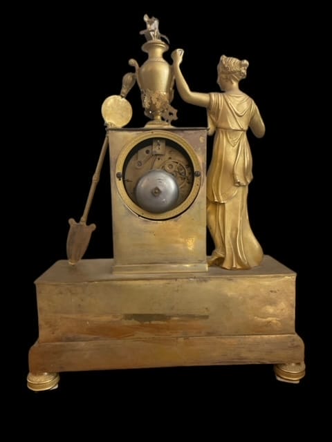 OROLOGIO IN BRONZO DORATO FINEMENTE CESELLATO RAFFIGURANTE ” LA VANITA’ ” QUADRANTE IN SMALTO BIANCO.
