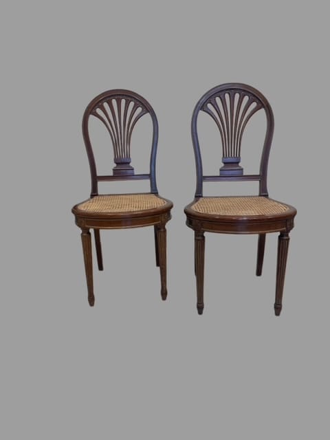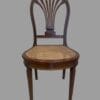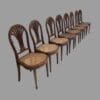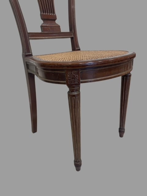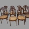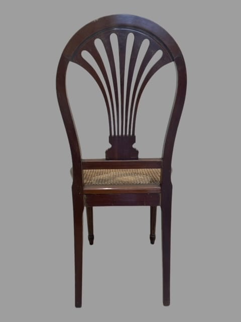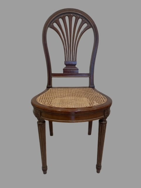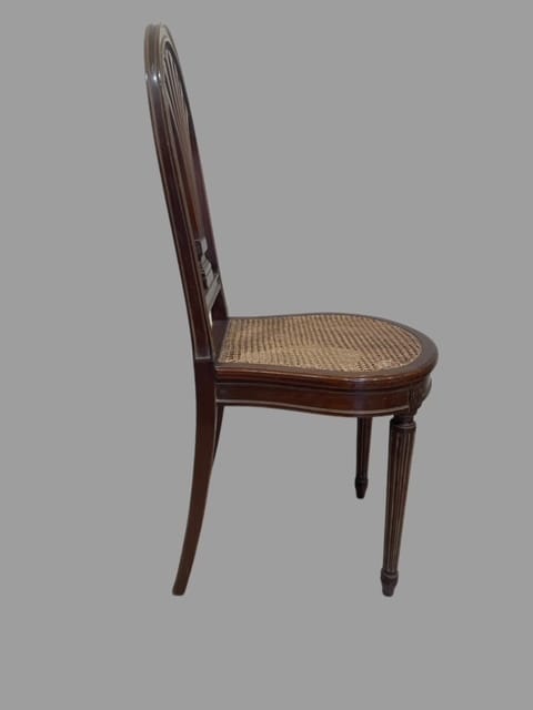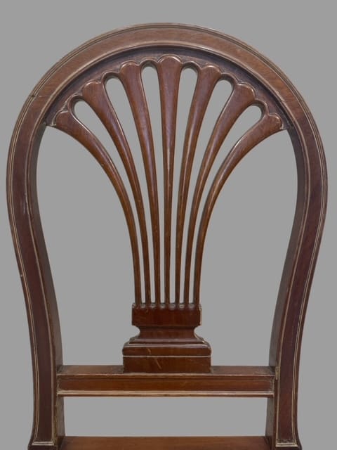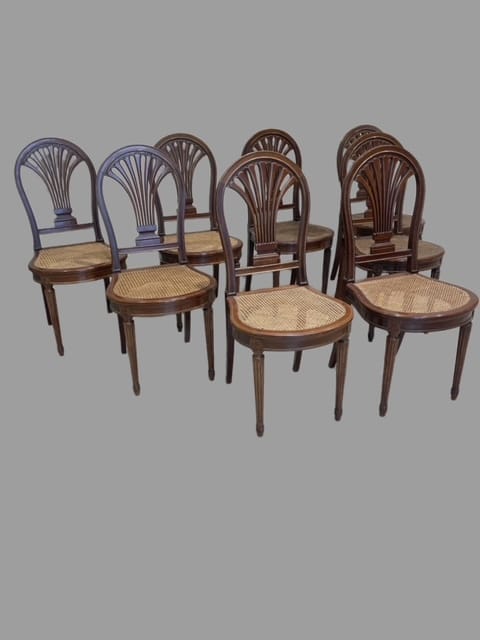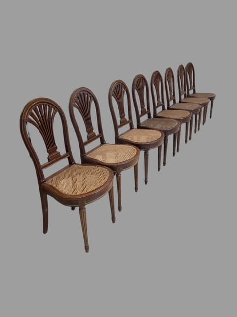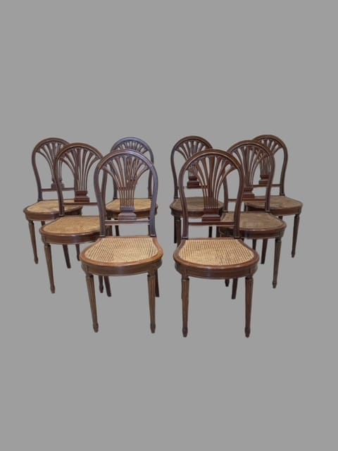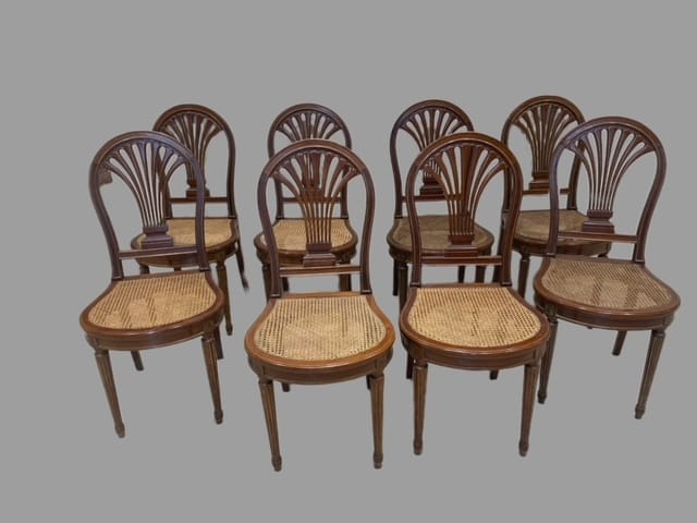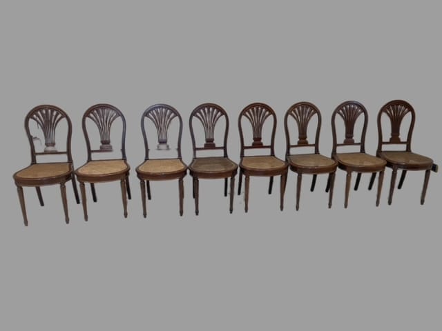 Otto sedie in mogano con schienale a mongolfiera e gambe dritte scanalate.