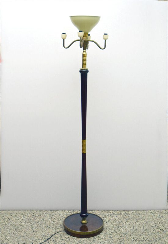 Struttura in legno di Mogano con finiture in ottone,piede in mogano con fascia in ottone e con copertura in cristallo.Porta diffusore in ottone con 4 bracciin ottone per luci laterali e una centrale. Diffusore originale in materiale plissettato con bordi in velluto.Impianto elettrico originale.