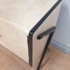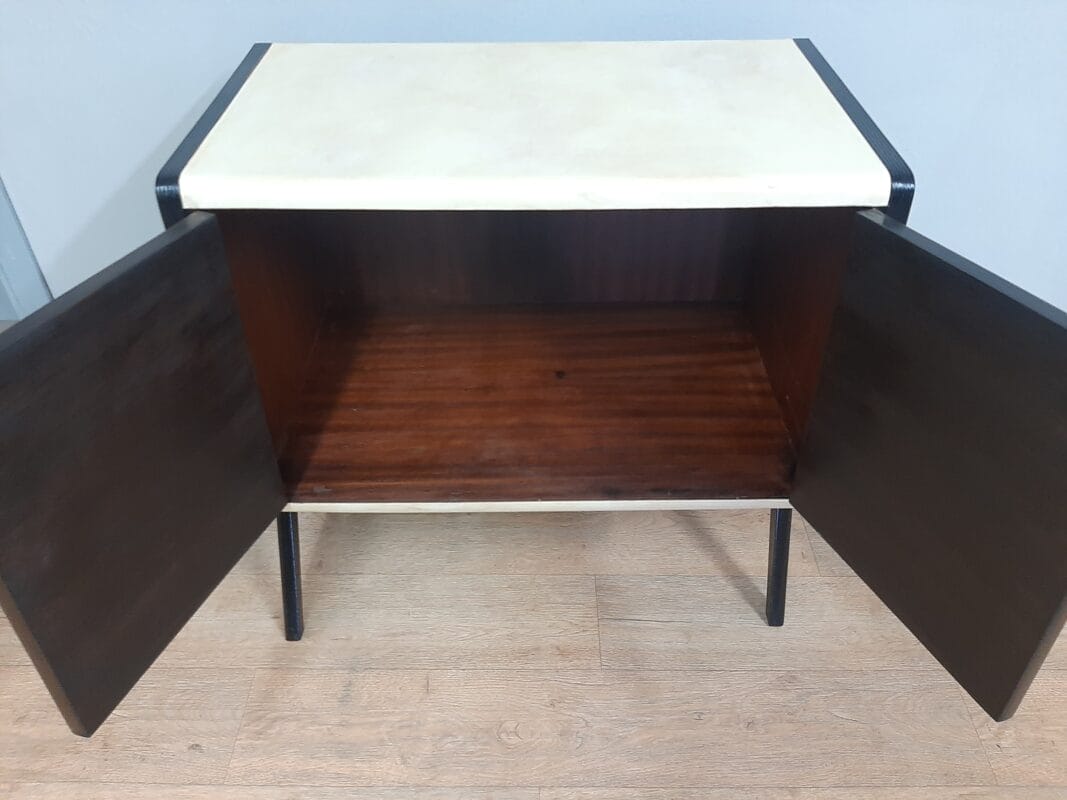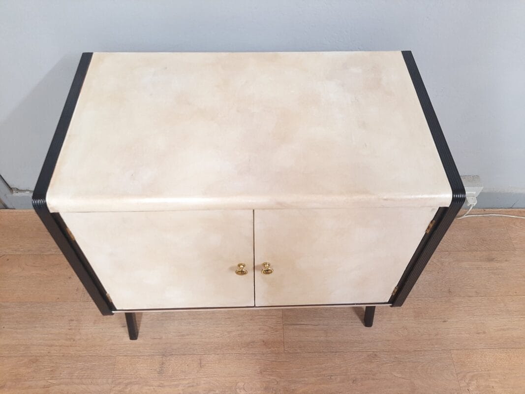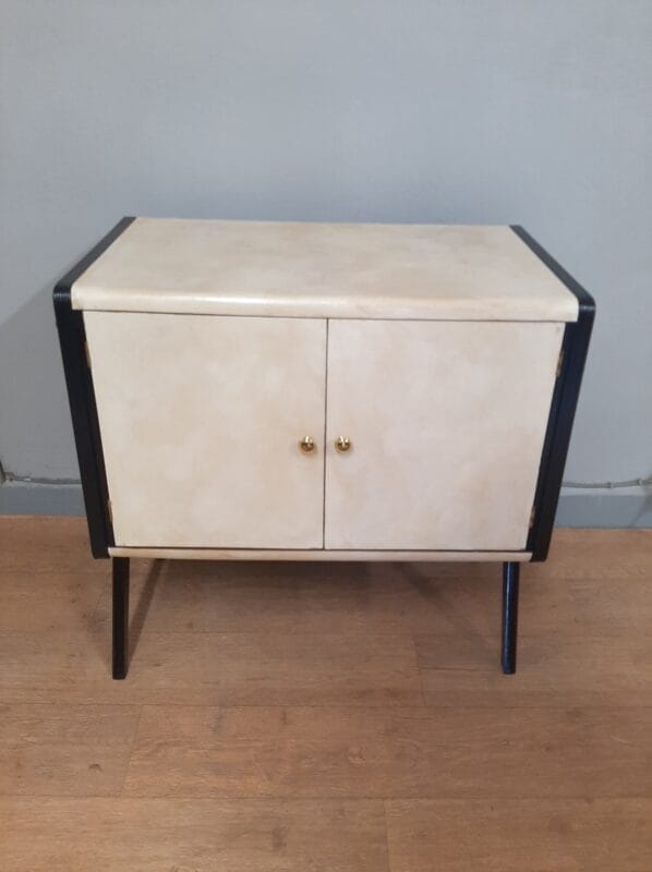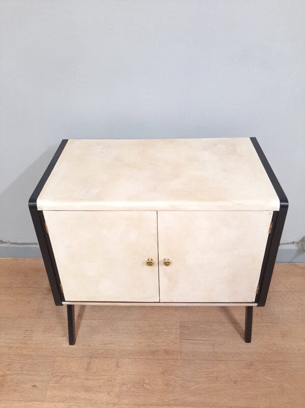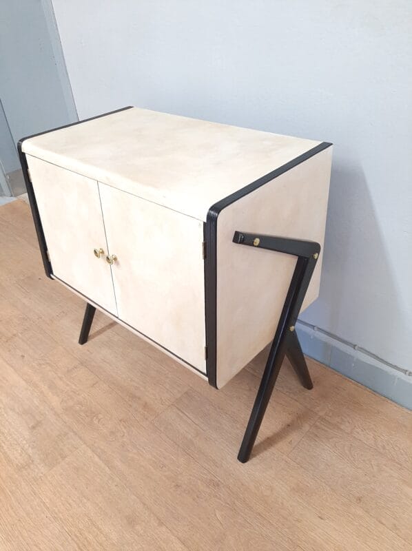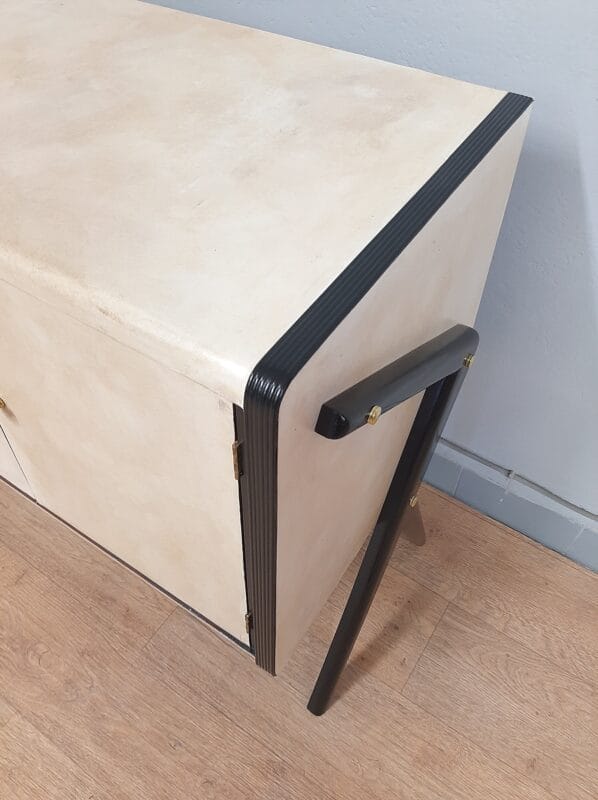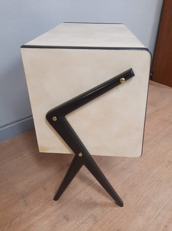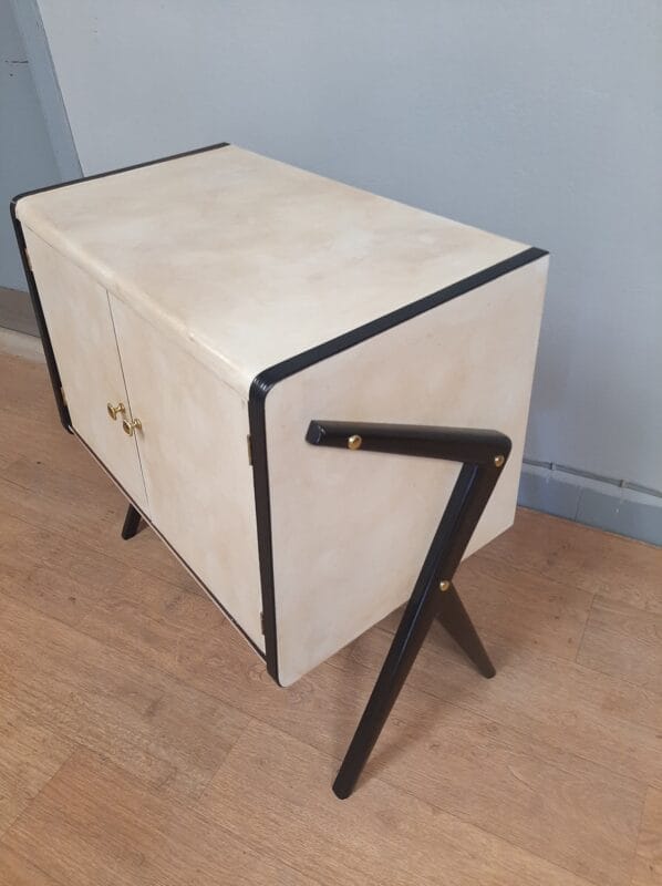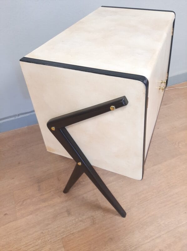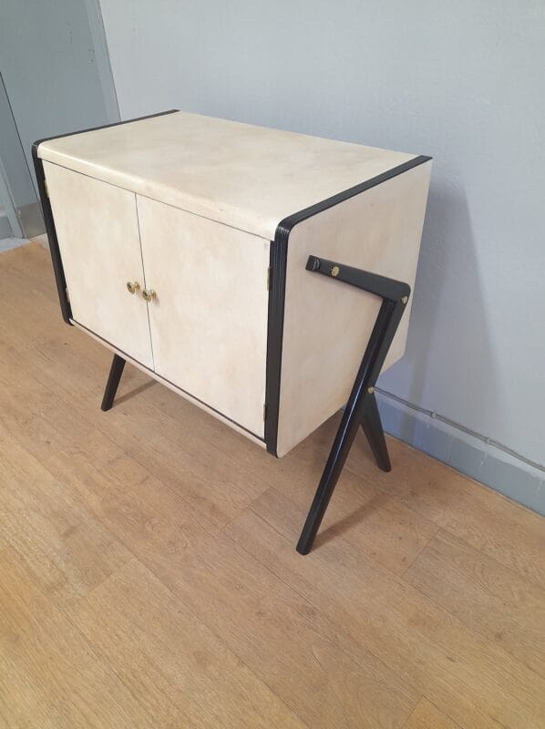 Piccolo mobile bar in lego laccato nero e rivestito in pergamena, molto particolare per le dimensioni contenute e il piede a “Y” tipico degli anni ’50. Restaurato in maniera professionale conservativa e lucidato a gommalacca, pronto per essere inserito da subito, presenta piccole macchie dovute all’ utilizzo. Dimensioni: cm 76-40-73 h