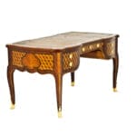Piccolo scrittoio a ribalta lastronato in bois de violette, Genova, XVIII secolo, la calatoia sagomata è intarsiata con motivi a rombo e cela all’interno una struttura a sei piccoli cassetti, tre vani e un segreto. Nella cintura sagomata due cassetti, gambe arcuate terminanti in scarpette metalliche,