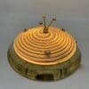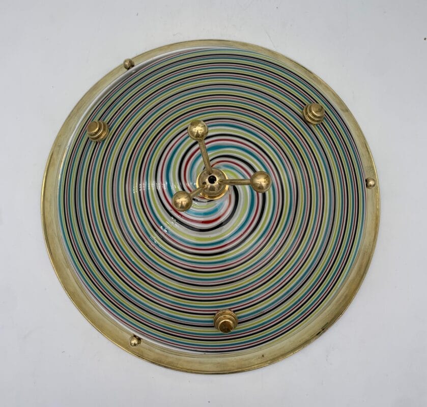 Lampada singola attribuita a Effetre. Plafoniera con ampia montatura circolare in ottone lucido e diffusore bombato in vetro decorato da fitte spirali concentriche multicolori; sulla sommità del vetro, fatto a mano a Murano, spicca un elemento ornamentale in ottone composto da tre aste inclinate che terminano con piccole sfere, mentre attorno al bordo del diffusore sono distribuite ulteriori borchie decorative in ottone che completano l’estetica vivace e preziosa dell’oggetto. L’insieme crea un effetto elegante e discreto, adatto a illuminare ambienti come corridoi, ingressi o camere da letto con un tocco di gusto vintage.