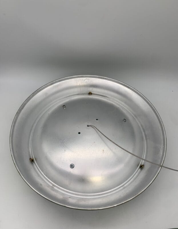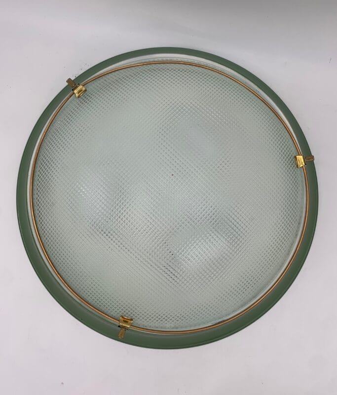 Al centro si trova un diffusore circolare in vetro lavorato a mano su stampo con una texture a rete incrociata, che serve a diffondere la luce in modo omogeneo riducendo l’abbagliamento. Il vetro è racchiuso da un sottile anello di ottone, fissato alla base tramite 3 piccole staffe dello stesso materiale, disposti in modo equidistante lungo il perimetro. L’insieme crea un effetto elegante e discreto, adatto a illuminare ambienti come corridoi, ingressi o camere da letto con un tocco di gusto vintage.