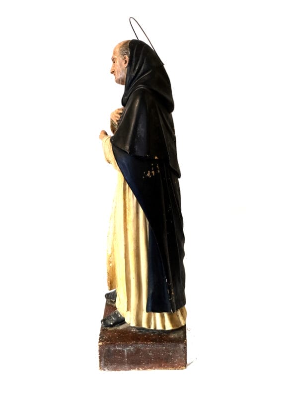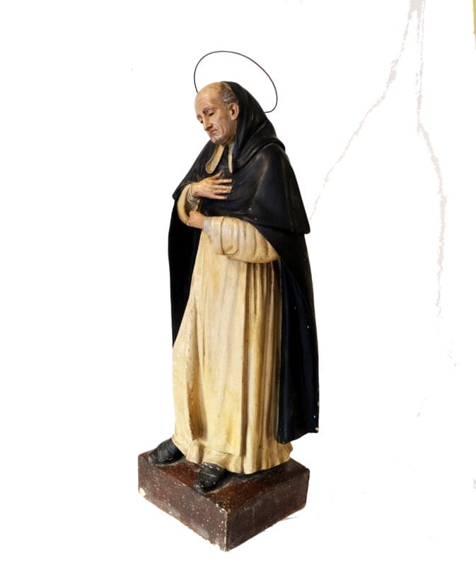 Scultura in terracotta policroma raffigurante “Santo Domenicano (San Domenico?)”. L’opera è attribuibile ad ignoto plasticatore attivo in Romagna nella prima metà del secolo XIX, probabilmente attivo nella bottega dei Ballanti Graziani, Faenza, prima metà del secolo XIX. Buono lo stato di conservazione. Sono presenti alcune piccole cadute di colore sul mantello e sulla veste e minime sbeccature sul plinto di base. Rotture e mancanze sulla mano destra. L ‘iconografia del santo in questione è alquanto insolita: si tratta certamente di un domenicano, come si può facilmente evincere dalla foggia e dai colori del saio. Non di meno, l’espressione del volto, di grande dolcezza che quasi si stempera in una velata mestizia mista a malinconia, ricorda quella classica di San Vincenzo de Paoli.