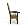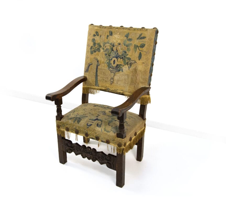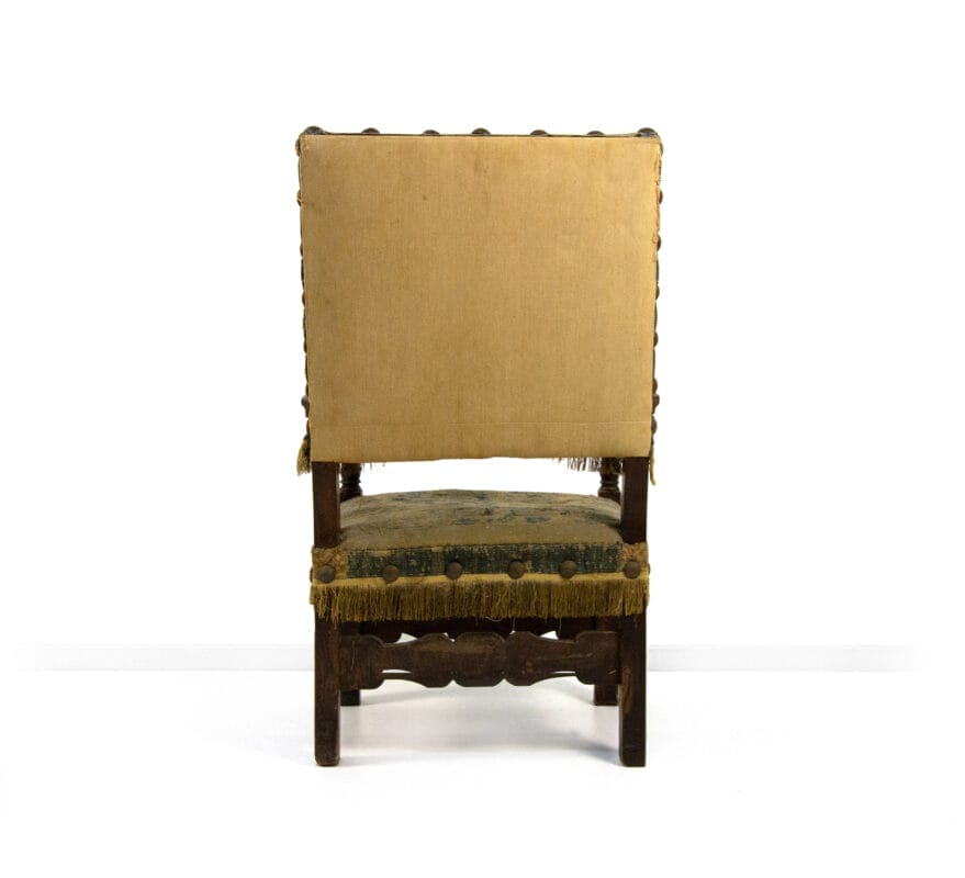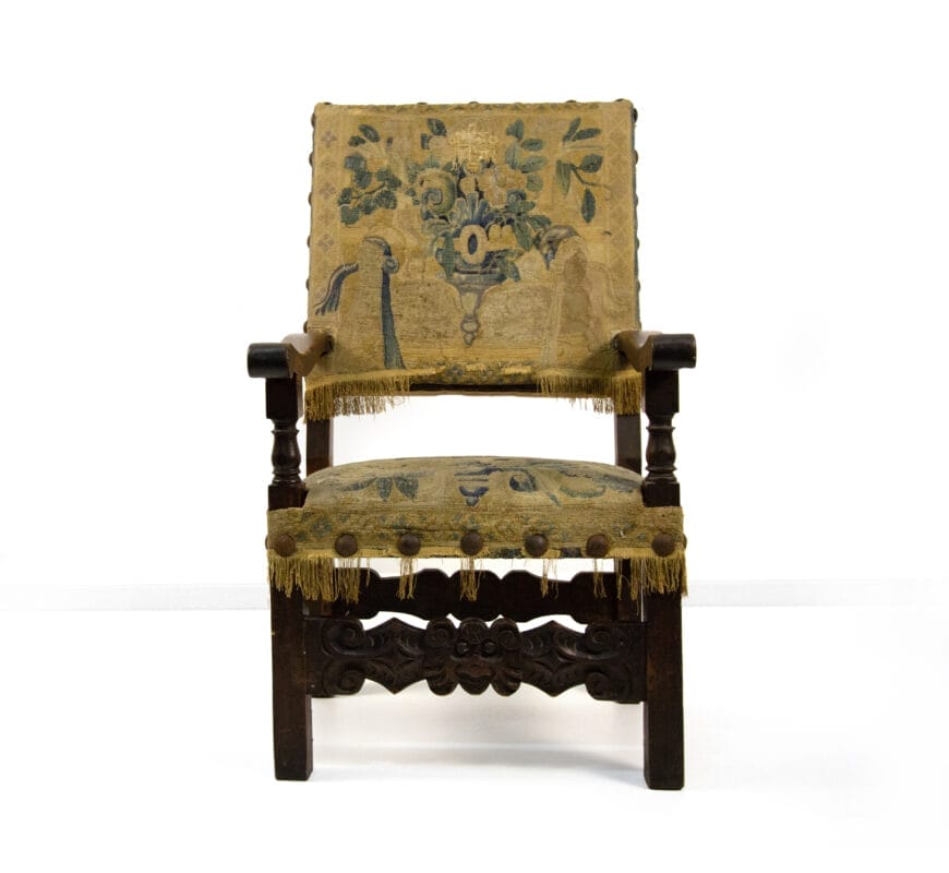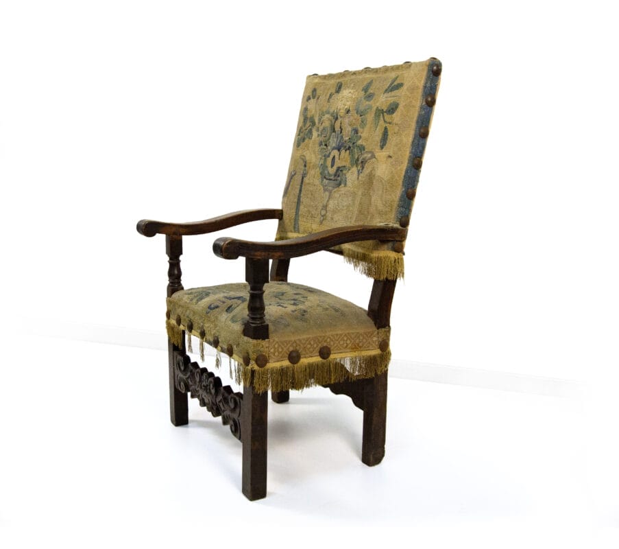 Poltrona in noce, XVII secolo, braccioli lievemente sagomati su montanti torniti a fuso; gambe quadrangolari raccordate da una fascia scolpita e intagliata a volute. Schienale e sedile imbottiti e rivestiti in tessuto ad arazzo coevo, cm 112x66x62, altezza seduta cm 49