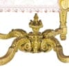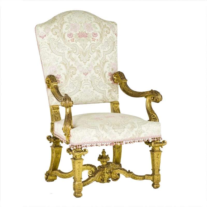 piemontese della seconda metà del Settecento. Realizzata in legno intagliato e finemente dorato a foglia oro. La struttura imponente e solida è caratterizzata da un raffinato lavoro di sculture ornamentali a motivi neoclassici, con dettagli floreali, volute e colonne tornite che arricchiscono braccioli e gambe.
