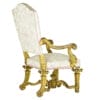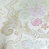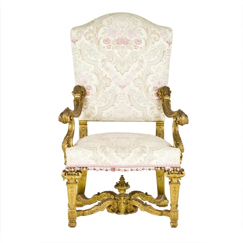 La seduta, lo schienale e i braccioli sono rivestiti con un pregiato tessuto damascato avorio dai delicati motivi floreali in tonalità pastello, con predominanza di rosa e verde salvia. Il bordo inferiore della seduta è rifinito con passamaneria decorativa, aggiungendo un ulteriore tocco di pregio.