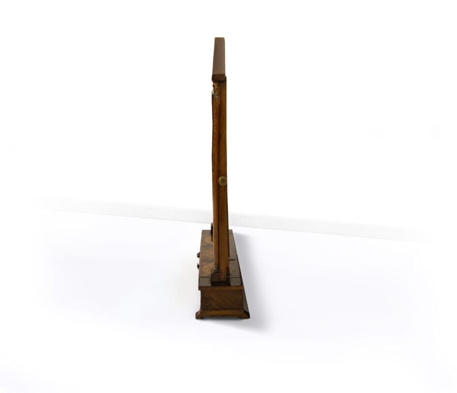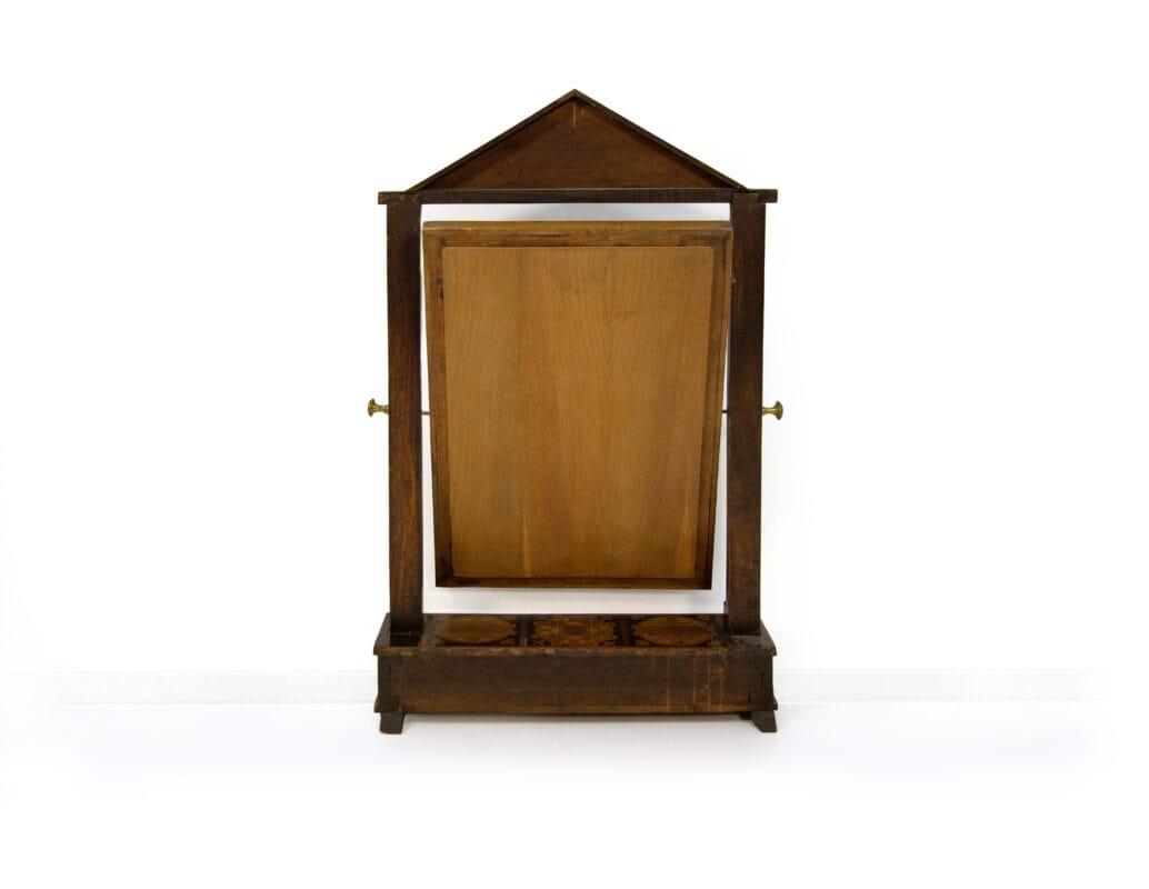 Psiche da tavolo in noce e intarsi in legni diversi, prima metà del XIX secolo, specchio basculante con cornice liscia e concava, affiancata da lesene tornite intarsiate a candelabre e terminanti in un capitello scolpito e dorato; cimasa a timpano centrato da una stella dorata a rilievo. La base quadrangolare presenta sul piano tre medaglioni intarsiati e un cassetto con girali fogliati, cm 87x56x17