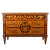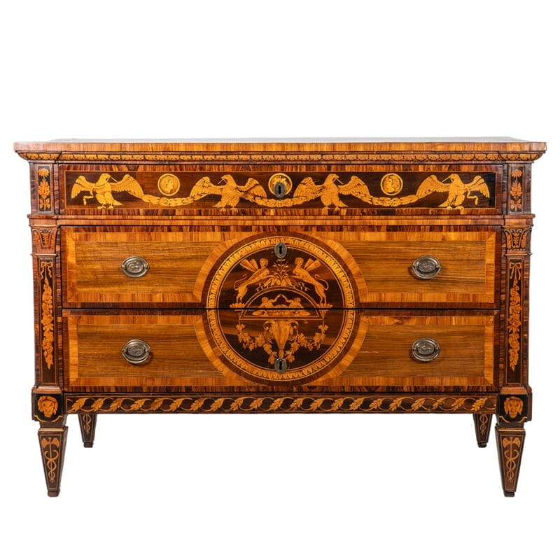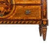 Elegante e rarissimo Cassettone lombardo di epoca tardo Settecento, realizzato in legno di noce con ricca e raffinata decorazione a tarsia. Il piano e i frontali presentano complessi intarsi geometrici e figurativi eseguiti con essenze pregiate quali acero, palissandro, bois de rose e altri legni rari, creando effetti cromatici di straordinaria raffinatezza.