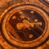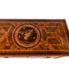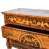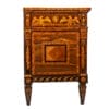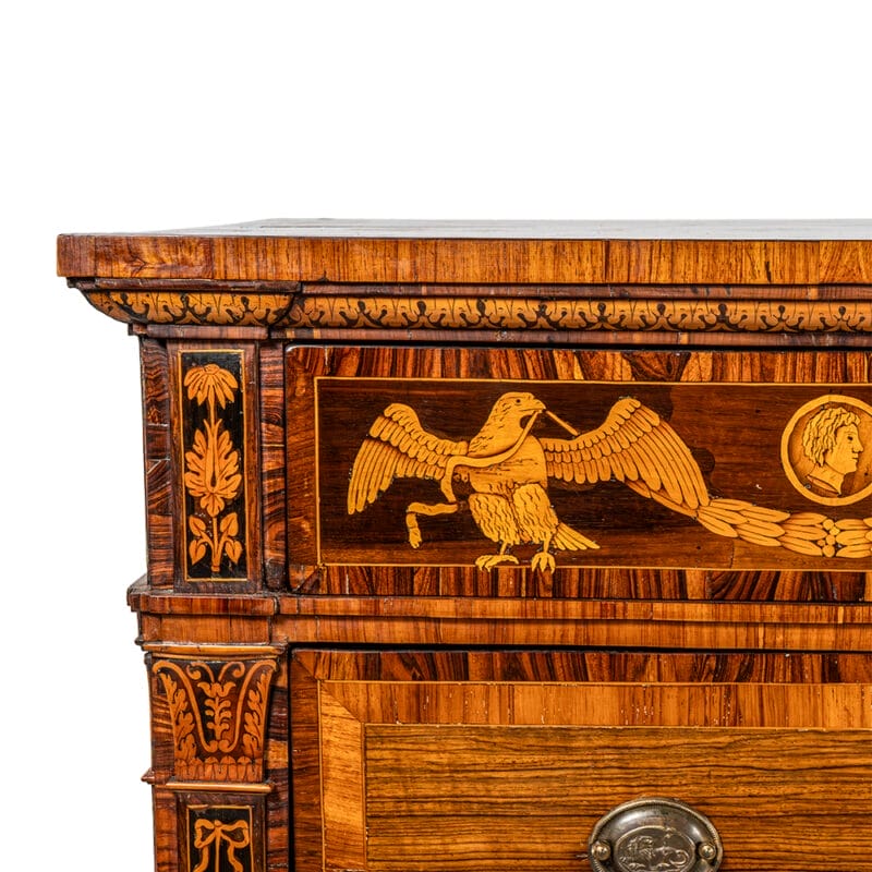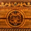 Il fronte è caratterizzato da due ampi cassetti decorati al centro da una riserva circolare con motivi classici, mentre la fascia superiore è ornata da fregi con figure alate e medaglioni. Le lesene angolari e i fianchi, anch’essi finemente intarsiati, completano la preziosità dell’insieme.