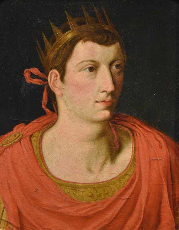 Si tratta di un dipinto facente parte di una serie di ritratti dedicati agli imperatori romani, in origine commissionati dal principe Maurizio d’Orange Statolder dei Paesi Bassi, poi nel 1680 passati in possesso del Grande Elettore. Tali opere, precisamente i primi dodici Cesari romani, furono realizzati tra il 1616 e il 1625 da vari pittori olandesi e fiamminghi, tra cui Rubens, Hendrick ter Brugghen, Michiel van Mierevelt, Dirck van Baburen (vedi immagine nei dettagli della stanza del Castello dove custodita la collezione dei Cesari).