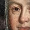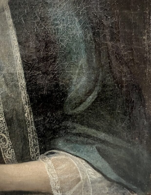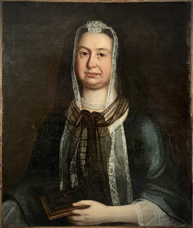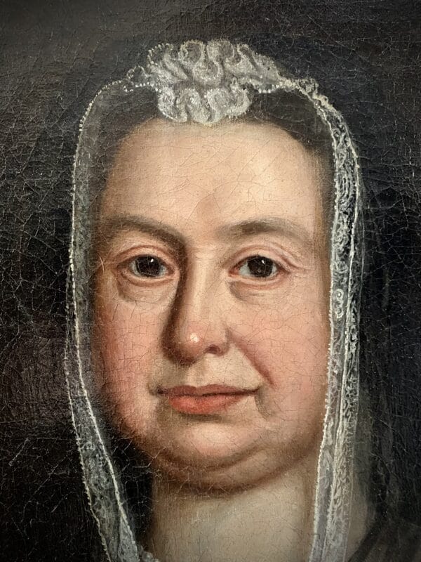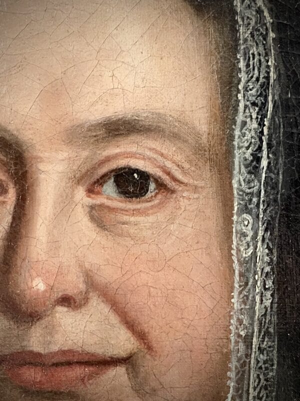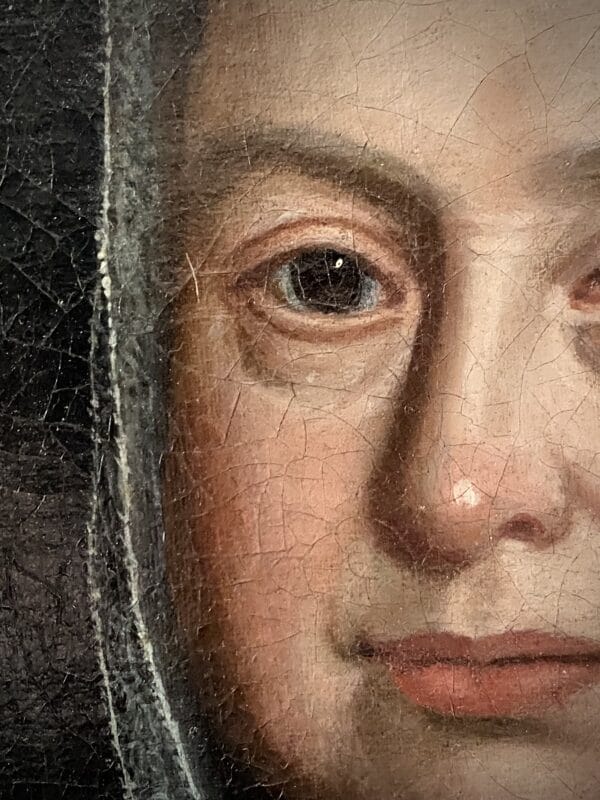 Olio su tela rintelata di ottima qualità, raffigurante una nobildonna inglese identificata come Theodosia Haslett, ritratta a mezzo busto con abito scuro in seta e merletti bianchi, adornata da un raffinato girocollo di perle e da un velo in pizzo che ne ingentilisce i lineamenti. La figura tiene tra le mani un piccolo libro di preghiere, elemento che conferisce all’opera un tono di compostezza tipico dei ritratti femminili inglesi di fine Settecento.