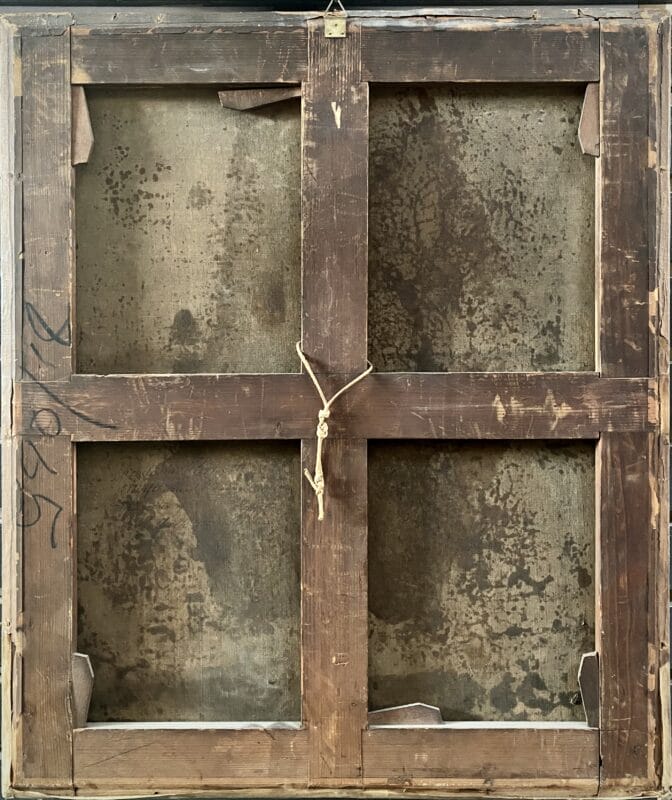 Il dipinto è stato rintelato, come visibile dal retro, e si presenta in buone condizioni conservative, con craquelure superficiale coerente all’età e una patina omogenea che conferisce profondità alla composizione.