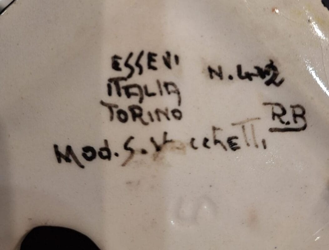 Sandro Vacchetti (1889-1976), Bambina con ciotola e cucchiaio in terraglia a colaggio con decoro policromo, marchio sulla base Essevi Italia Torino, 1935-1940 circa, modello 412, altezza 30 cm.