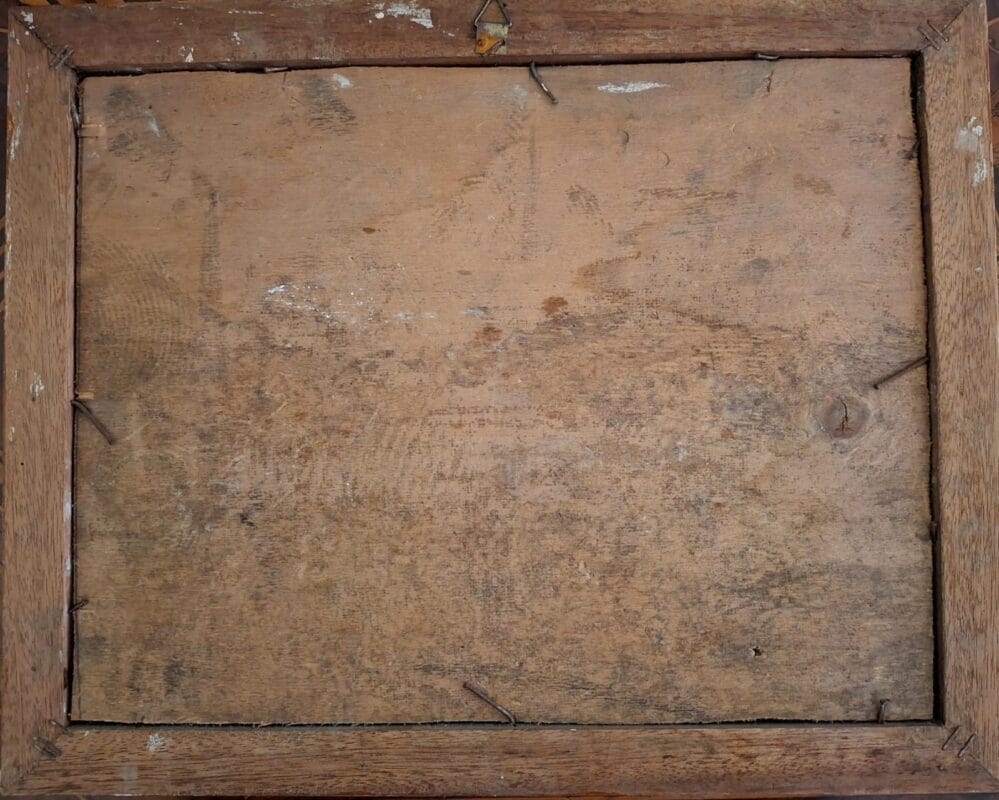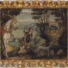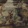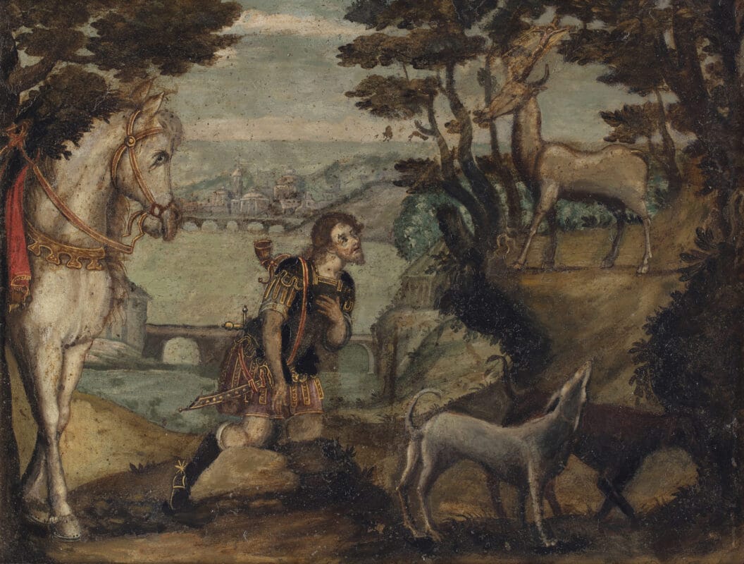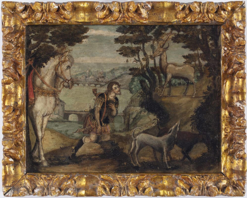 Sant’Eustachio e il cervo, pittore della scuola di Anversa, XVI secolo, olio su rame, misure 25.5×33 cm, con cornice 31×38.5 cm.