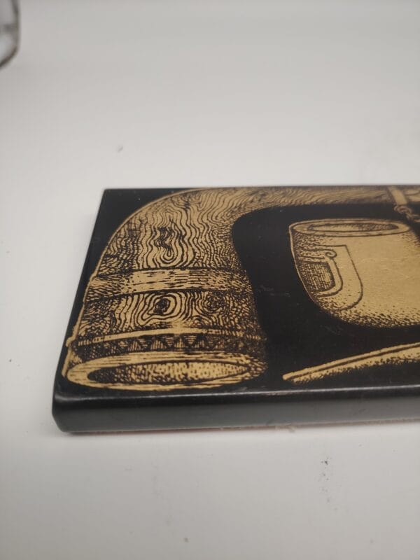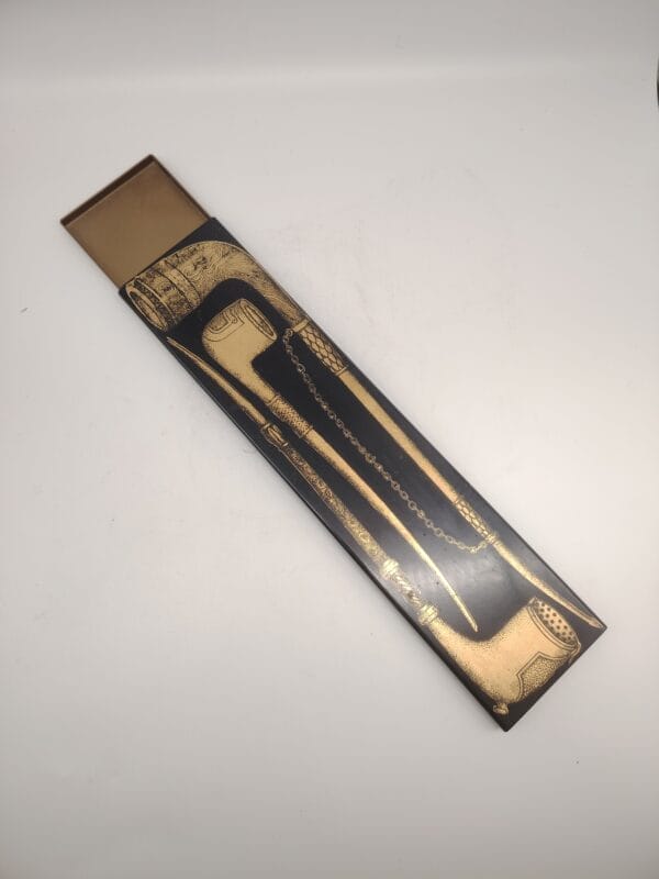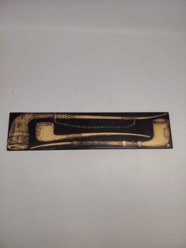 Scatola portafiammiferi di Piero Fornasetti-Atelier Fornasetti, Milano, Italia, prodotto negli anni ’60. In metallo decorato e serigrafia in oro con silhouette di pipe cassetto anodizzato oro e ricoperto di tela rossa come molti oggetti dello stesso design. Buone condizioni generali Vintage.