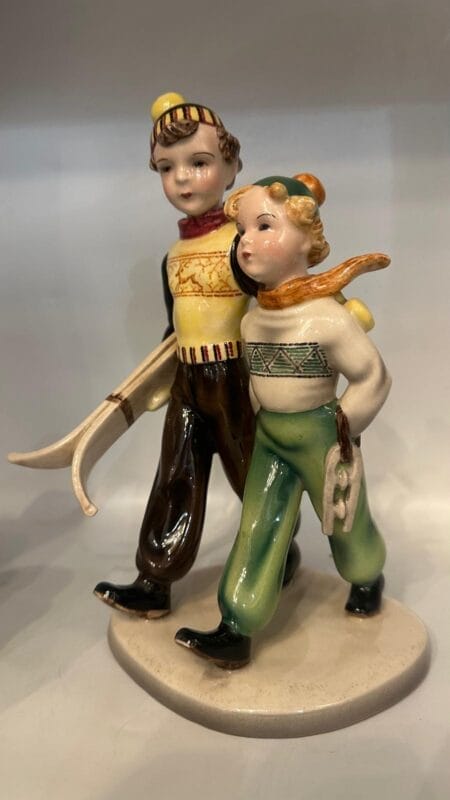 Elegante ceramica, realizzata in Austria, raffigurante due giovani sportivi in abbigliamento invernale d’epoca.