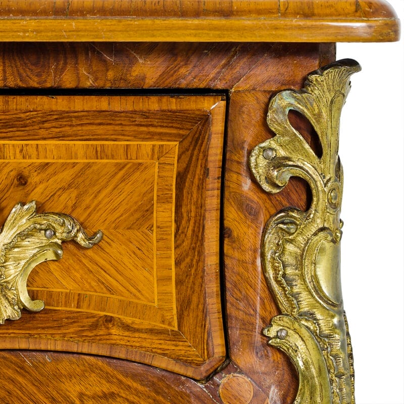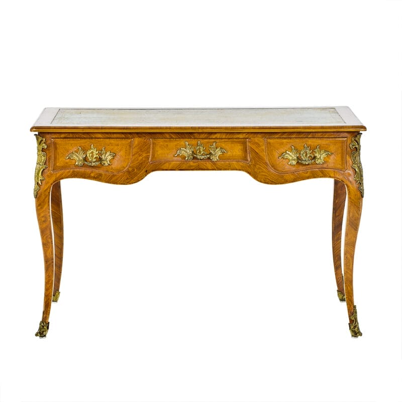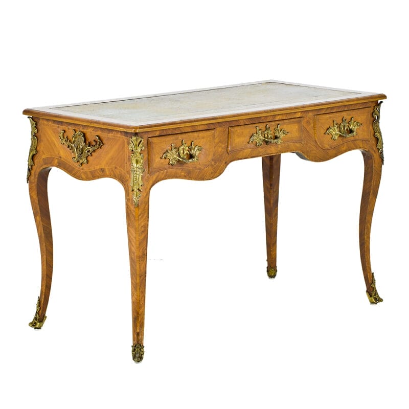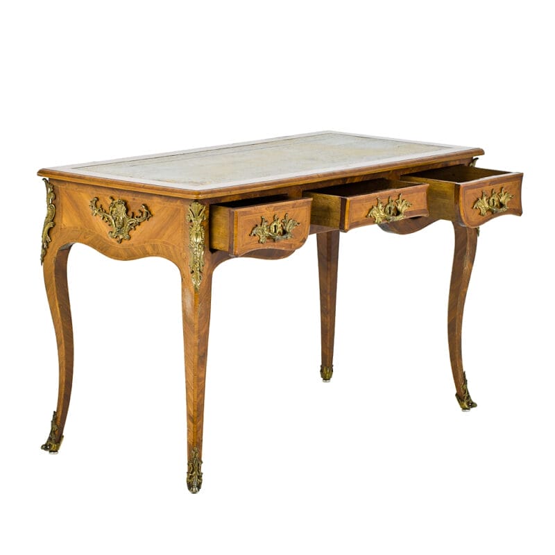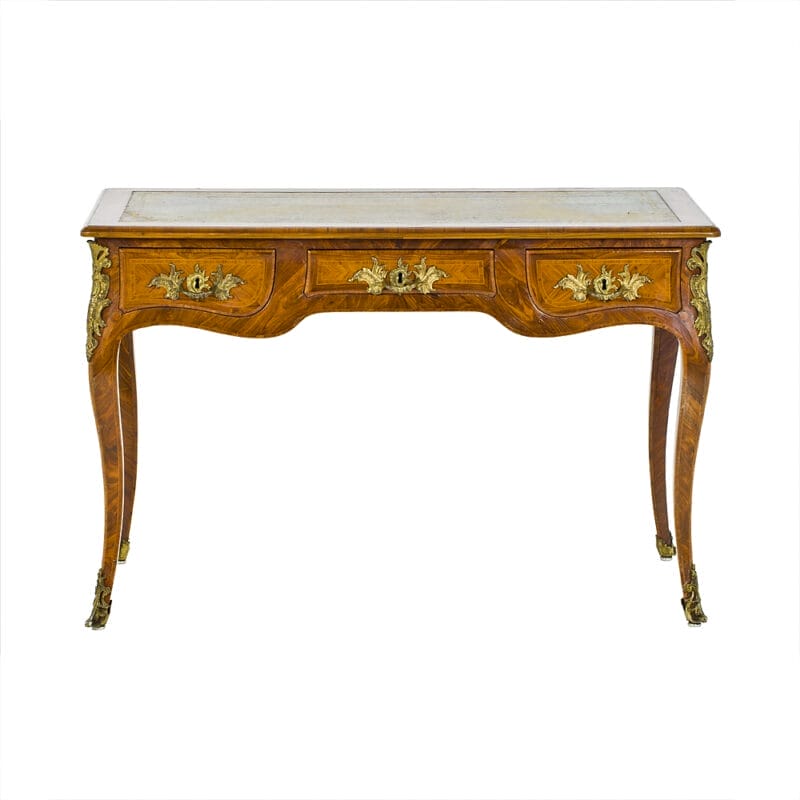 Elegantissimo Scrittoio Luigi XV francese della prima metà del XVIII secolo. L’opera è eseguita con grande maestria in legno di bois de rose e bois de violette, due essenze pregiate che conferiscono al mobile un raffinato contrasto cromatico e una straordinaria venatura. Linee sinuose con gambe mosse e sagomate, piano profilato e fronte ondulato con tre cassetti. Ricca la decorazione in bronzo dorato a mercurio, finemente cesellata, presente nei raccordi, maniglie, bocchette e piedini, che dona preziosità e brillantezza all’insieme.