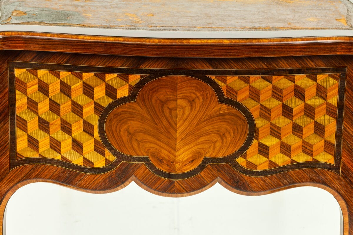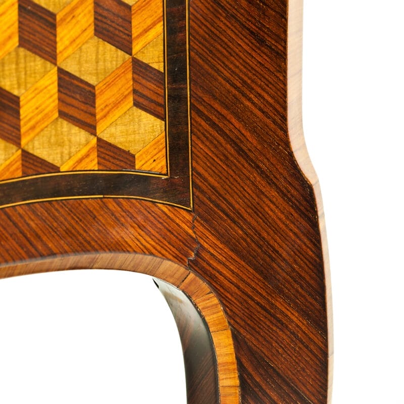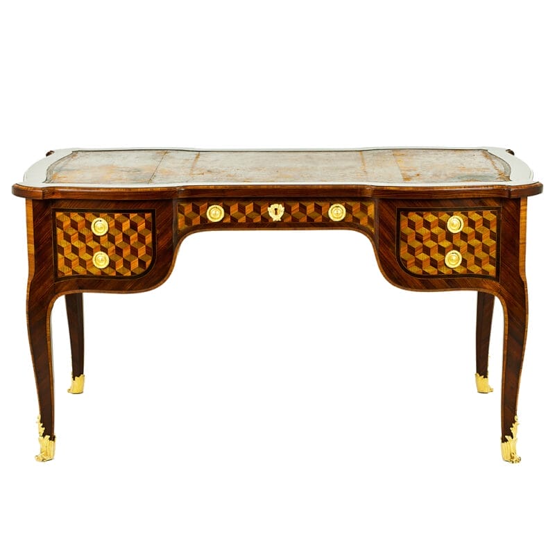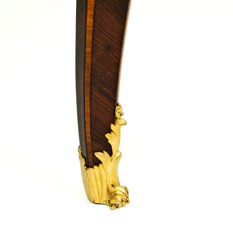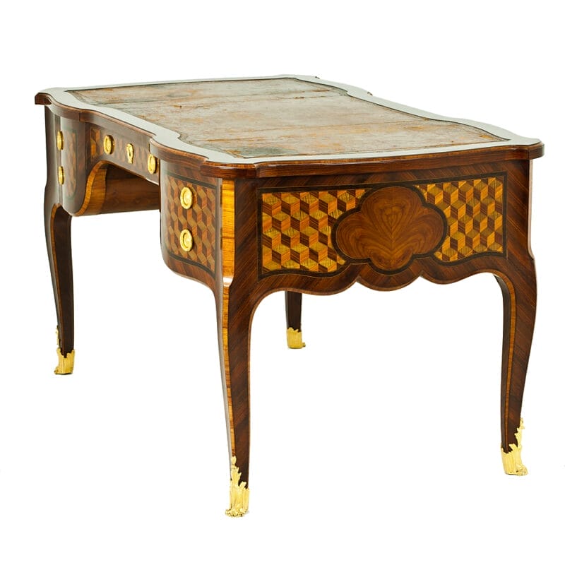 Bellissima scrivania in legno boate de violette e boate de rose, intarsiata a marchetteria. Applicazioni in bronzo dorato ai piedi della scrivania e ai pomelli.