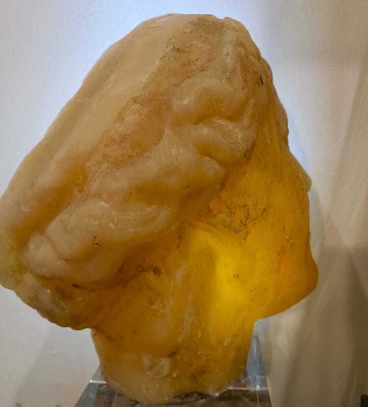 L’effetto ambra, ottenuto attraverso la particolare lavorazione della cera, dona all’opera una luminosità unica e un tono caldo e avvolgente. Quando viene illuminata posteriormente, la testa di Venere sembra risplendere dall’interno, diffondendo una luce dorata che ne esalta la delicatezza dei lineamenti.