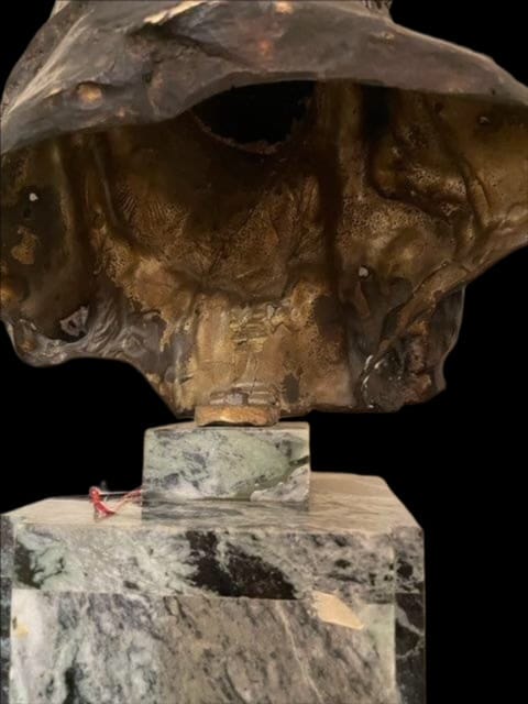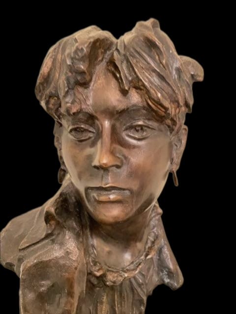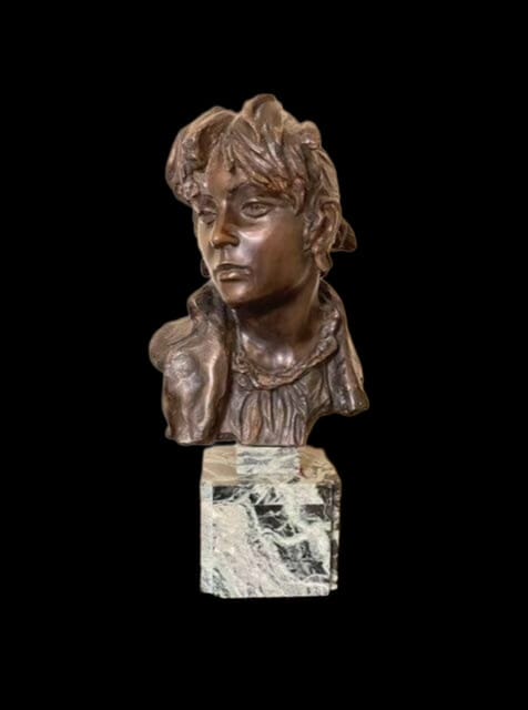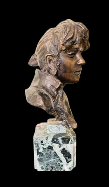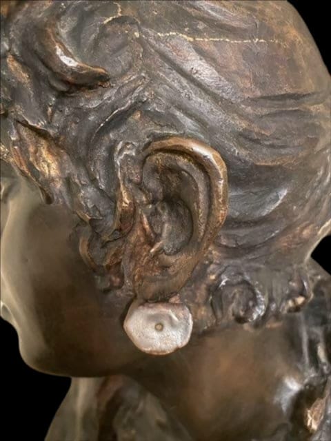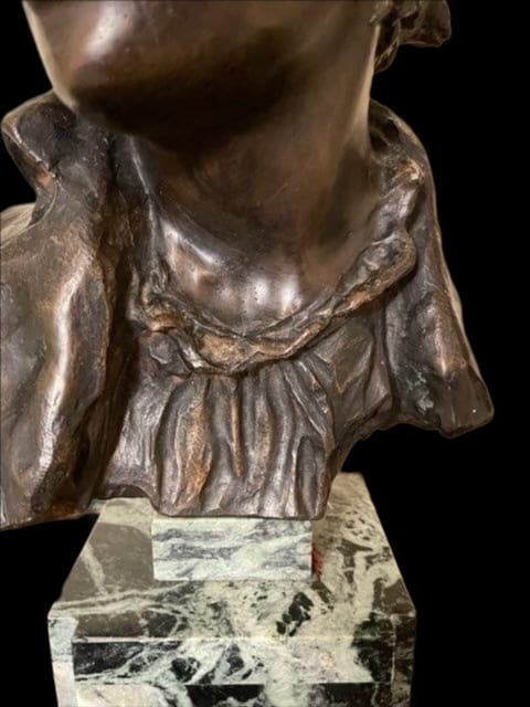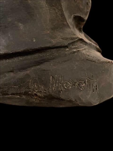 SCULTURA IN BRONZO RAFFIGURANTE GIOVANE DONNA FIRMATA ” MORETTI “. BASE IN MARMO VERDE.