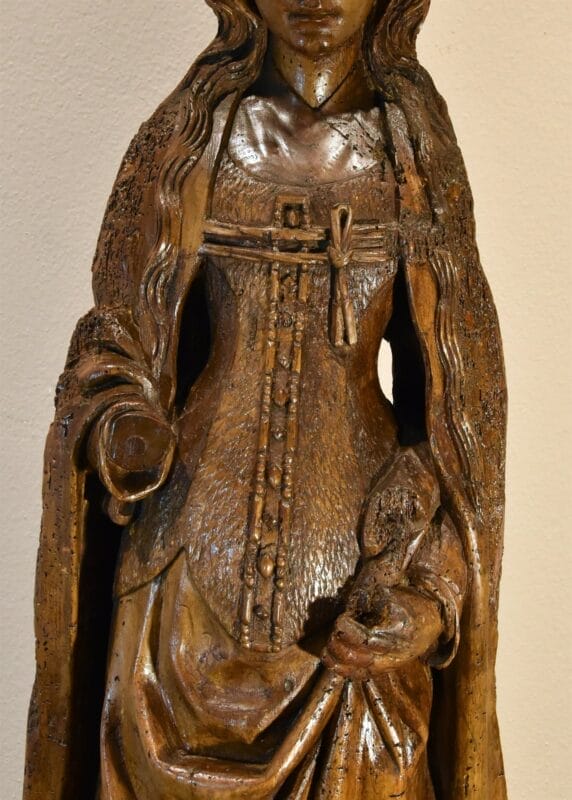 A proposito di suggestioni fiamminghe, l’opera riprende infatti la magnifica statua, con medesimo soggetto, ora custodita al Museum Catharijneconvent di Utrecht, opera di fine XV secolo del Maestro di Leende (vedi immagine nei dettagli, https://adlib.catharijneconvent.nl/Details/collect/42290). Tipico dell’arte fiamminga gli abiti sontuosi con pesanti pieghe, le teste arrotondate a forma di uovo, occhi con palpebre a mandorla, le ciocche di capelli spesse e distanziate e una sottile attenzione per i dettagli.