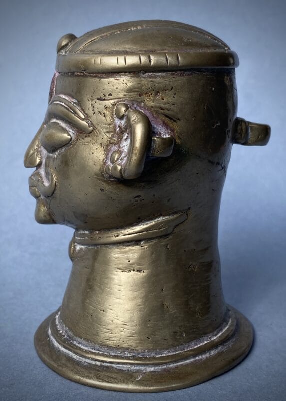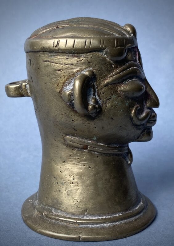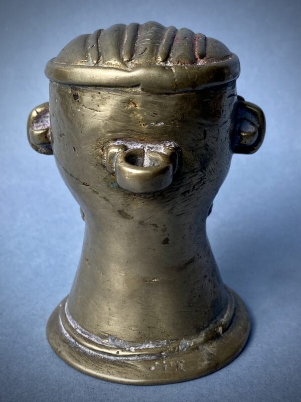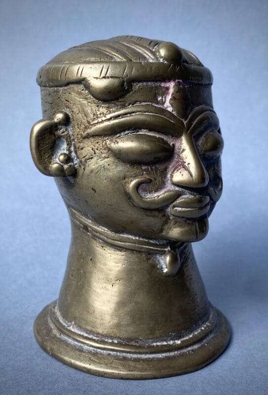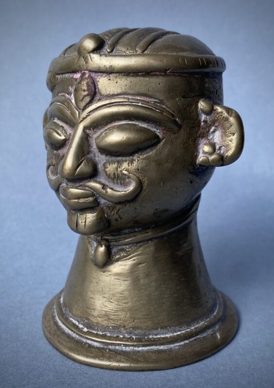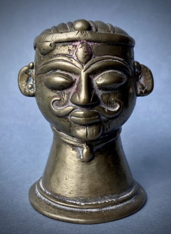 Testa antropomorfa di Śiva modellata come mukha-liṅga ossia il volto del dio che affiora dall’emblema aniconico del liṅga; la forma tronco-conica svasata alla base richiama esplicitamente l’inserzione su Ionipita (yoni-pīṭha) per l’abhiṣeka, dove il canale di scolo raccoglieva le libazioni. I tratti sono vigorosi e votivi: grandi occhi semi-chiusi per il darśana, arcate sopracciliari a rilievo che disegnano il terzo occhio a goccia al centro della fronte, naso diritto, baffi ricurvi e piccolo śmaśru al mento.