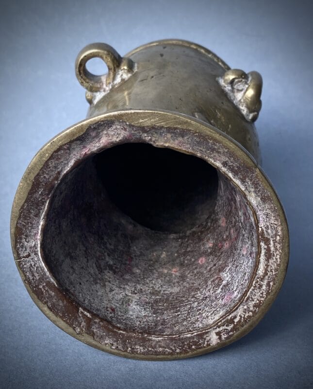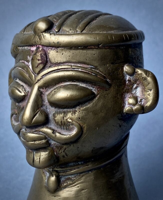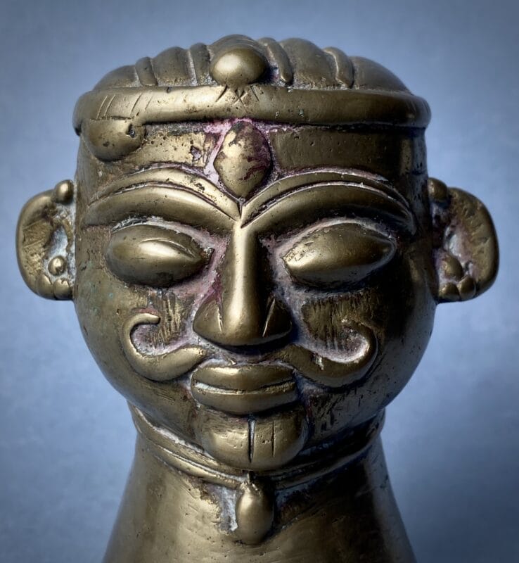 Bronzo fuso a cera persa, patina rituale con residui di sindūra/kuṅkuma nelle incisioni, India centro-occidentale (ambito deccano/maharashtri), XVIII–XIX secolo.