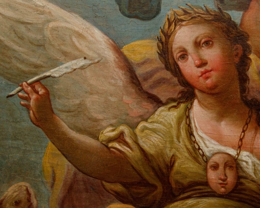 La seconda tavola, invece, raffigura l’Allegoria della Poesia o della Storia: in questo caso la donna, diversamente dall’altra, è dotata di grandi ali bianche, che contribuiscono ad identificarla come una creatura celeste o una personificazione legata all’Ispirazione, al Genio o alla Fama; sul capo porta una corona d’alloro, simbolo universale di gloria, onore e, specificamente, della Poesia e della vittoria intellettuale. Nella mano destra tiene una penna d’oca, mentre al collo indossa un medaglione con una maschera, che potrebbe simboleggiare la Storia, che ricorda il passato, o il Teatro. I putti che la attorniano rafforzano, di fatto, l’interpretazione allegorica, immortalati intenti a reggere un libro aperto, simbolo della conoscenza e delle discipline intellettuali e a suonare una tromba, attributo principale della Fama, che ha il compito di diffondere e celebrare le opere scritte.