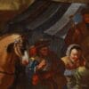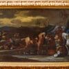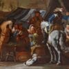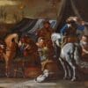 Il dipinto in esame si colloca nella florida tradizione della pittura fiamminga del XVII secolo, un periodo in cui la pittura si concentrò sulla rappresentazione delle scene di genere, in contrasto con i soggetti storici o religiosi predominanti altrove. L’opera, che si sviluppa orizzontalmente, raffigura una concitata scena di accampamento o di sosta, probabilmente di un gruppo di soldati o viaggiatori inseriti su più piani prospettici. Analizzando più attentamente le figure, l’attenzione è catturata dai due destrieri minuziosamente definiti, uno dal manto beige colto di profilo, mentre l’altro bianco ritratto da dietro, come erano soliti fare molti artisti fiamminghi che si cimentavano in questo genere. Le figure attorno ai cavalli indossano abiti che suggeriscono un contesto militare o comunque di viaggio, con cappelli piumati e vesti tipiche dell’epoca. Intorno alle figure principali, si svolge una scena di vita quotidiana: diversi personaggi sono seduti, mangiano, bevono o conversano, creando un’atmosfera di riposo e cameratismo. Si notano oggetti come botti, ceste e suppellettili, indicando l’attività di ristoro e rifornimento. Sulla destra, è, infatti, visibile una tenda o un riparo di fortuna, elemento tipico degli accampamenti, mentre i cane accucciato aggiunge un tocco di realismo domestico alla scena.