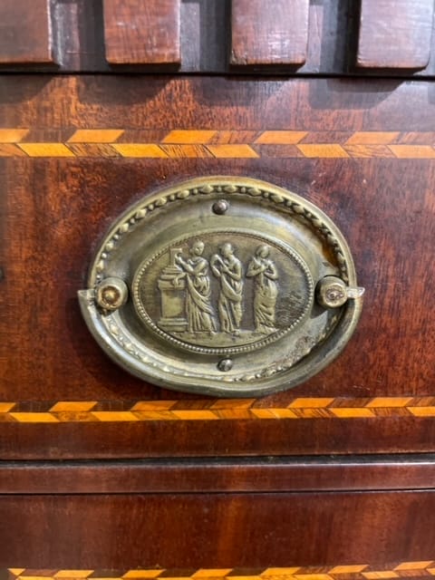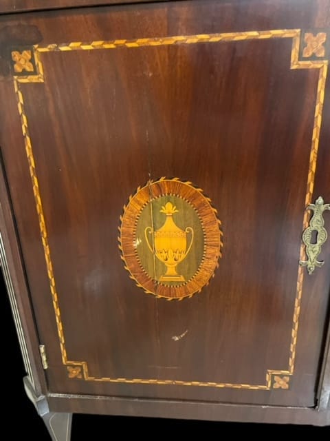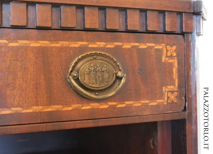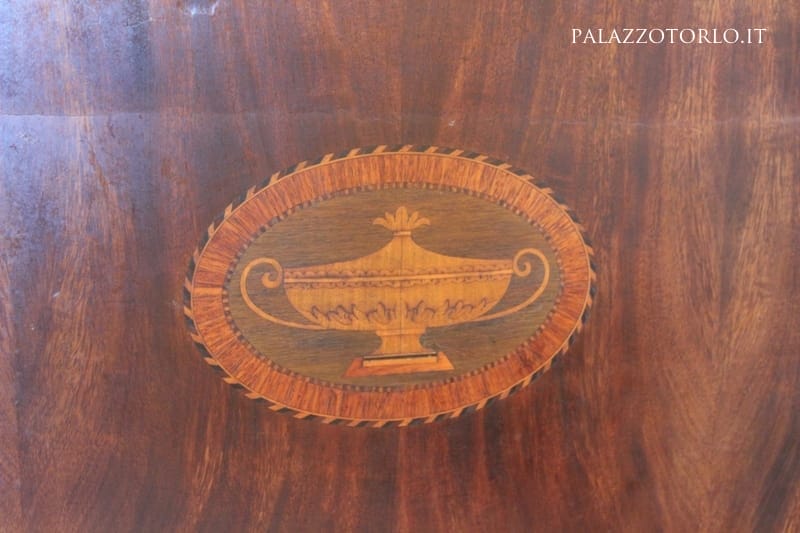 Mobile secretaire in mogano con intarsi in legni vari e tinti. Anta a ribalta con scrittoio e scomparti interni. Piano in marmo bianco di Carrara.