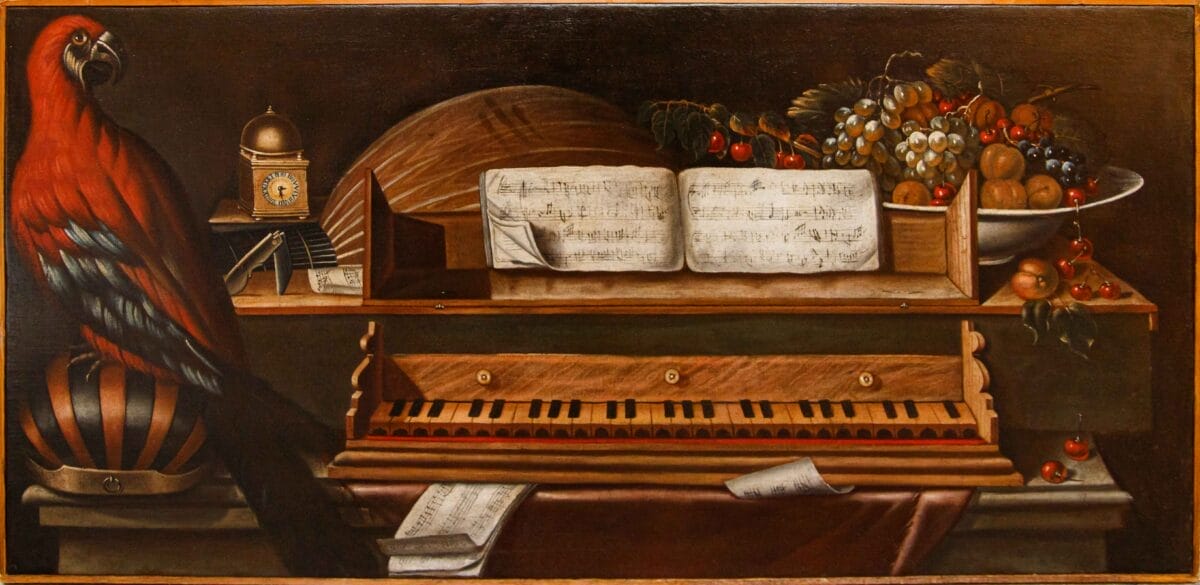 La coppia di tele orizzontali in esame ci mostra due interessanti nature morte che presentano una ricca e dettagliata composizione di strumenti musicali, animali, cibi ed oggetti di diversa specie e funzione, perfettamente orchestrata all’interno di spazi neutri, contraddistinti solo da un ripiano in pietra appena visibile in primo piano. L’accurata disposizione degli oggetti solo apparentemente casuale ci portano ad identificare il loro autore come un seguace del celebre pittore bergamasco Evaristo Baschenis (Bergamo, 1617 – 1677), sulla base di un calzante confronto con la Natura Morta con strumenti musicali conservata al Museum of Fine Arts di Boston. Entrambi i dipinti riflettono, infatti, la predilezione per l’accostamento di strumenti musicali, come il pianoforte ed il liuto, che traevano ispirazione da quelli suonati da ensemble da camera che si esibivano per gli ospiti invitati in case private, con altri elementi simbolici, tipica del genere sviluppatosi nell’Italia settentrionale del Seicento. Le nature morte con strumenti musicali di Baschenis divennero così famose in tutta Italia che, negli anni 1640, l’artista stesso fondò un laboratorio per produrre copie e varianti dei suoi dipinti. La prima tela propone una struttura compositiva basata sulla celebrazione degli strumenti musicali e della natura morta, ma con un’impronta più esotica e sontuosa. L’attenzione è immediatamente catturata dalla figura imponente di un grande pappagallo rosso e azzurro sulla sinistra, simbolo di lusso che conferisce alla scena un tono più vivace e meno austero. Al centro della composizione domina un organo da tavolo o un piccolo clavicembalo con la tastiera in legno, sopra il quale si trova lo spartito musicale. Dietro il pappagallo, si nota un piccolo orologio da tavolo con una campana, richiamo al concetto di tempus fugit. Sul lato destro, si sviluppa una ricca composizione di frutta, con grappoli d’uva bianca e scura, ciliegie rosse ed altri frutti estivi disposti in una ciotola e sparsi sul piano. Il protagonista della seconda tela, invece, sembra essere un grande strumento a corda, forse un contrabbasso o una viola da gamba molto grande, il cui corpo in legno lucido occupa gran parte dello spazio. Accanto ad esso, appoggiato, si distingue un violino più piccolo, riposando su alcuni drappi e spartiti musicali. Alla sinistra, su una superficie rialzata, è posizionato un globo terrestre con una mappatura antica, al di sotto del quale è posizionata una ciotola bianca colma di castagne, affiancata da un agrume. La rappresentazione della frutta e degli strumenti musicali non è solo realistica, ma fortemente intrisa di un senso di vanitas, ricordando allo spettatore l’ineluttabilità del tempo che passa e la caducità dei piaceri terreni. L’elemento più singolare e narrativo si trova sulla destra: una piccola cornice che racchiude un quadro nel quadro. Questo dipinto raffigura una scena di genere, con figure popolari impegnate in un banchetto o una festa rustica, suggerendo un contrasto tra il mondo elevato dell’arte e della musica e quello più terreno e popolare. Gli spartiti musicali sparsi contribuiscono a dare un senso di attività interrotta, come se il musicista si fosse allontanato un attimo prima.