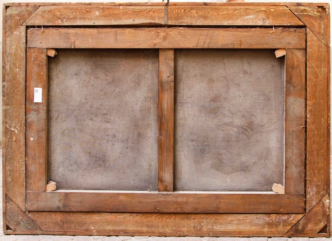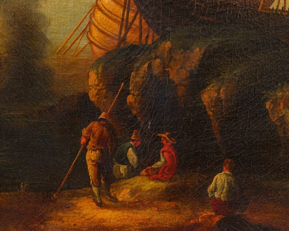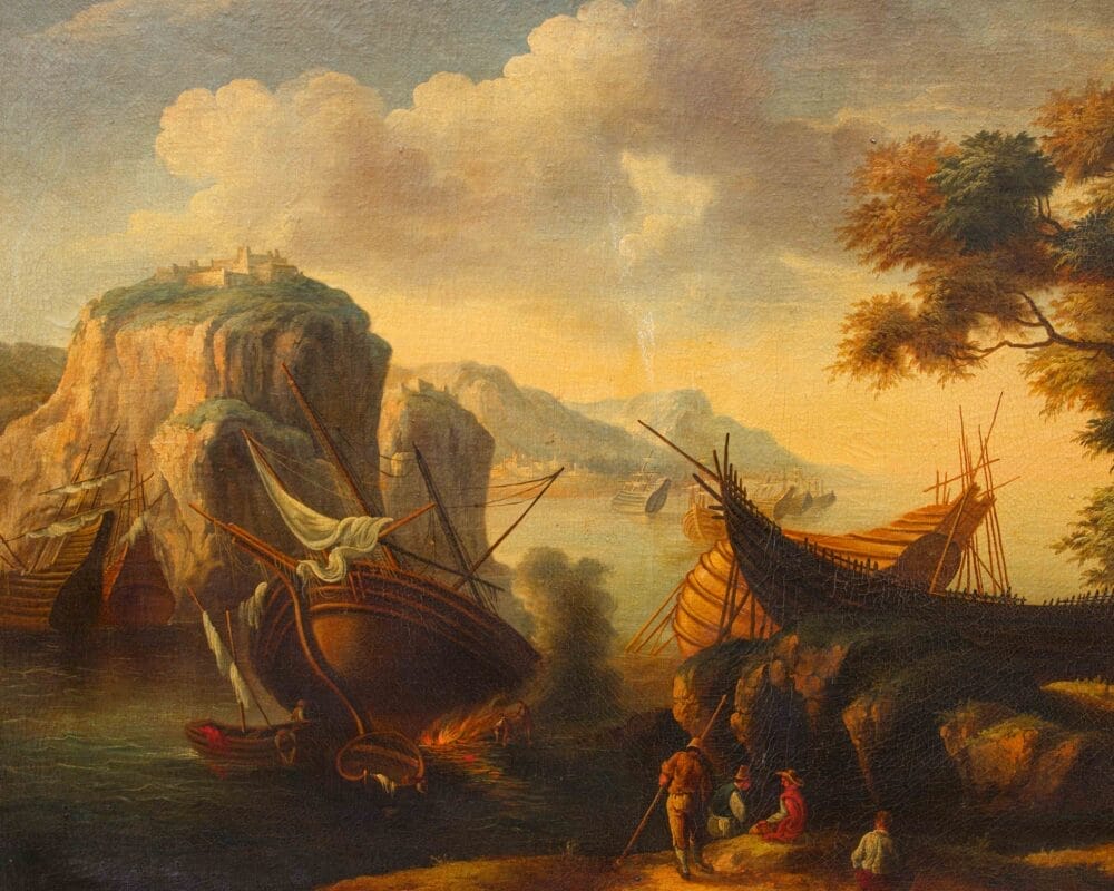 La presente veduta costiera, dal taglio prospettico virtuosamente affettato, evoca gli esempi del paesaggismo italianizzante sviluppatosi a Roma nel corso del Seicento e diffuso in particolar modo da Salvator Rosa (1615-1673). La veduta riprende un dipinto dell’artista napoletano, oggi conservato nelle Gallerie Estensi di Modena: La Veduta di una baia, parte di una serie di tre tele eseguite da Salvator Rosa a Roma tra il 1639 e il 1640 su commissione del duca Francesco I d’Este, poi collocate nel Palazzo Ducale di Sassuolo e quindi trasferite nel 1786 nel Palazzo Ducale di Modena. In un’insenatura chiusa sulla destra da un edificio diroccato sulla cui porta è riconoscibile lo stemma estense e limitata a sinistra da un picco roccioso, alcuni uomini sono indaffarati nella riparazione di vascelli; una suggestiva luce avvolge le figure e il paesaggio, splendido nella veduta della costa lungo la quale sono ormeggiate le imbarcazioni.
