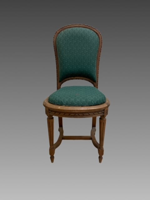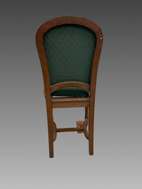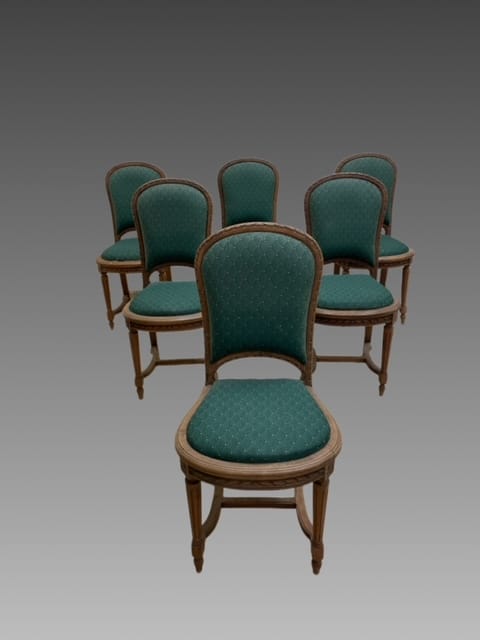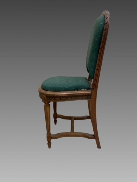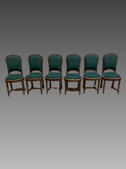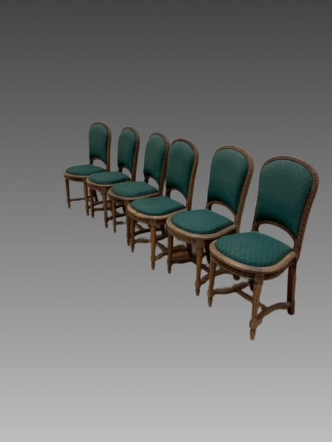 Sei sedie in noce intagliato con motivo nastriforme, gambe dritte unite da crociere, schienale e seduta in bottiti in stoffa verde
