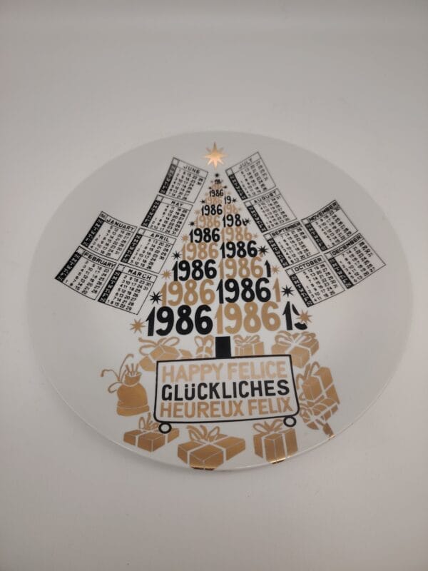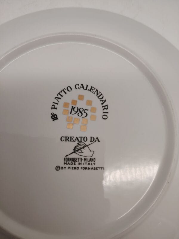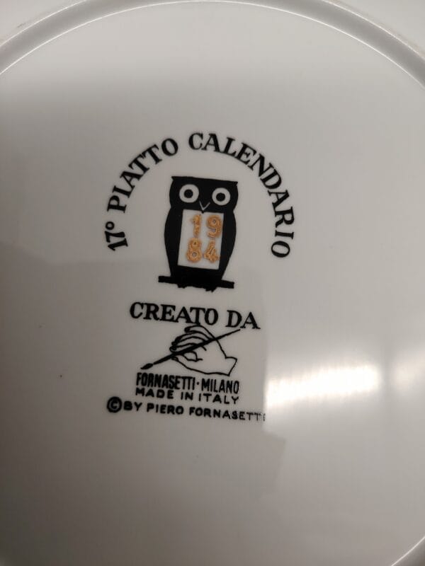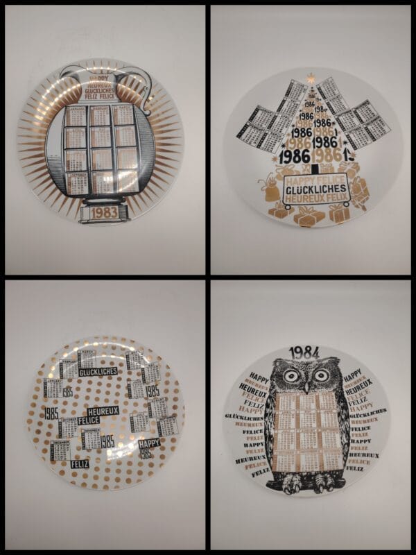 Raro set di 4 Piatti serie calendario, disegnati da Piero Fornasetti per Atelier Fornasetti. Anni 83/84/85/86, Vendibili anche singolarmente al prezzo di 150€ l’uno.