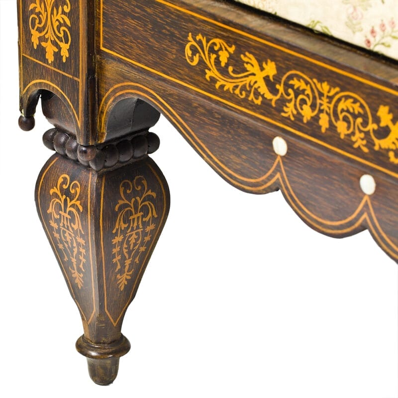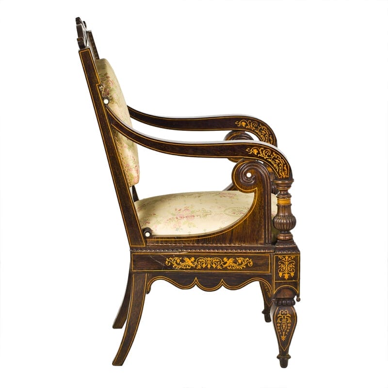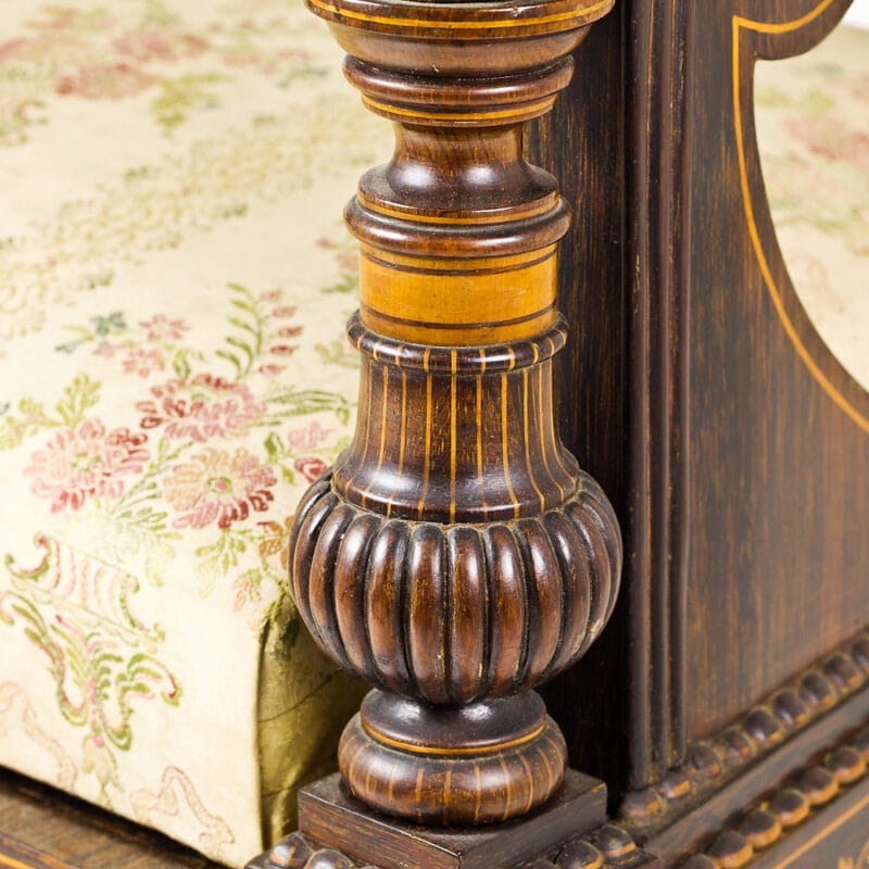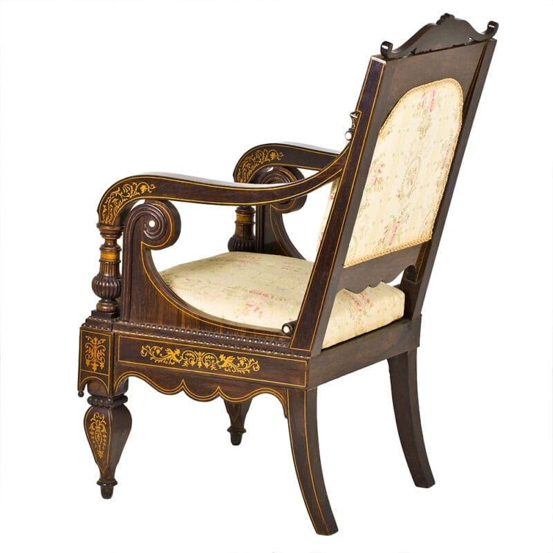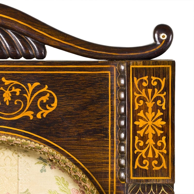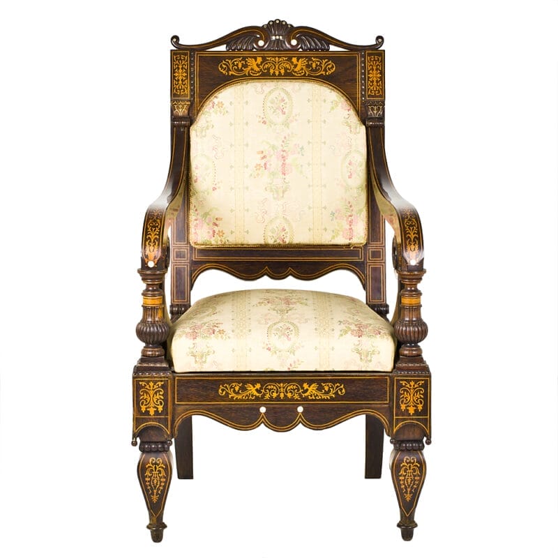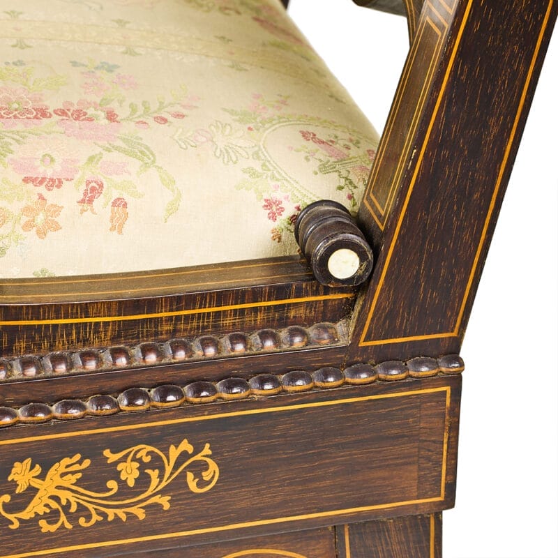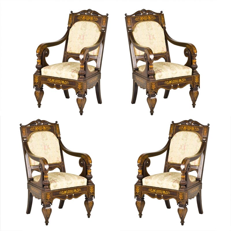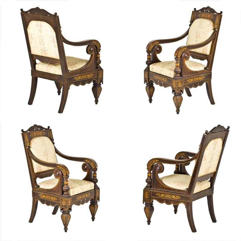 Set di Quattro Poltrone dei primi dell’Ottocento e provenienza napoletana. Realizzate in legno di palissandro con intarsi in acero e madreperla. Stoffa di San Leucio.