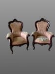 Il design è caratterizzato da linee semplici ma rigorose, che incarnano l’eleganza raffinata e sobria preferita in questo periodo storico. Delicati intagli floreali ornano la struttura in legno, aggiungendo un tocco artistico e migliorando l’estetica complessiva. Per un maggiore comfort, i sedili sono dotati di cuscini su misura, elegantemente rivestiti in ricco velluto rosso, che offrono stile e sostegno.