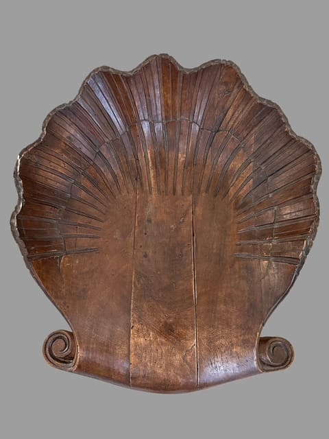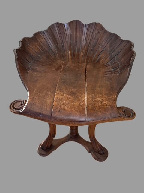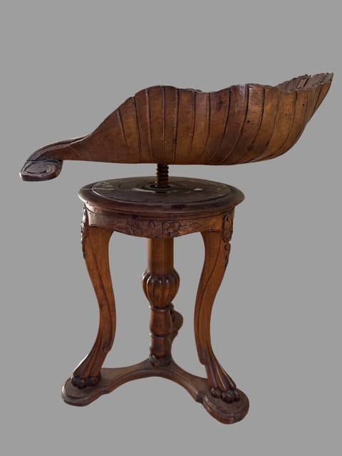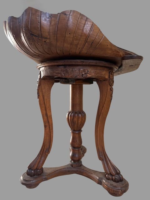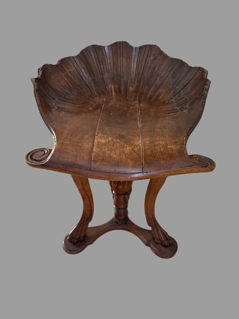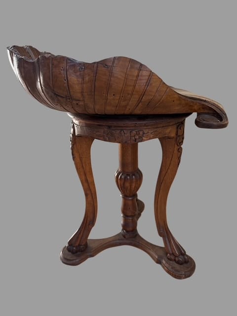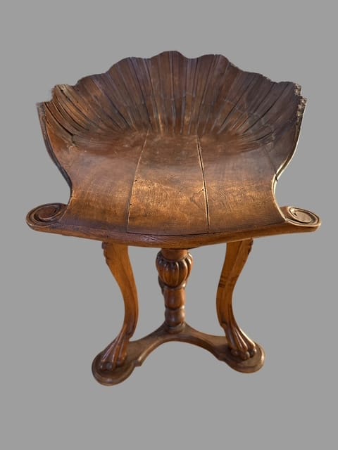 Sgabello in legno di noce intagliato con tre piedi curvi che sorreggono seduta a forma di conchiglia.