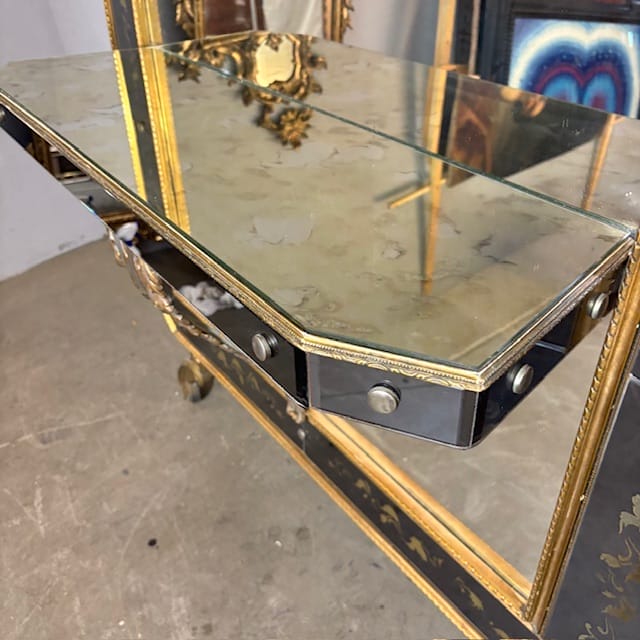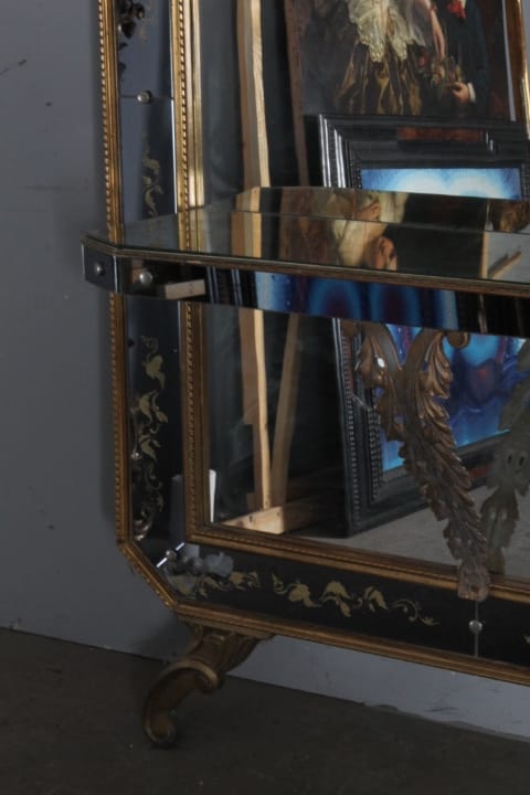 Specchiera da terra/ parete Murano anni 60 Cristal Art design . Mis H 202 L 114 . Altezza mensola cm 85 . Prof 30 . Oro e cornice nera . Disegno Pier Luigi Colli