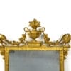 Specchiera in legno scolpito e dorato, Napoli, fine del XVIII secolo, cornice rettangolare a motivo scanalato; sulla cimasa due volatili trattengono ciascuno una ghirlanda fiorita che si ricongiunge alle anse di un vaso fiammato. Alla base sui lati due foglie d’acanto poggiano su cespi fogliati e zampe leonine, cm 178x84x11