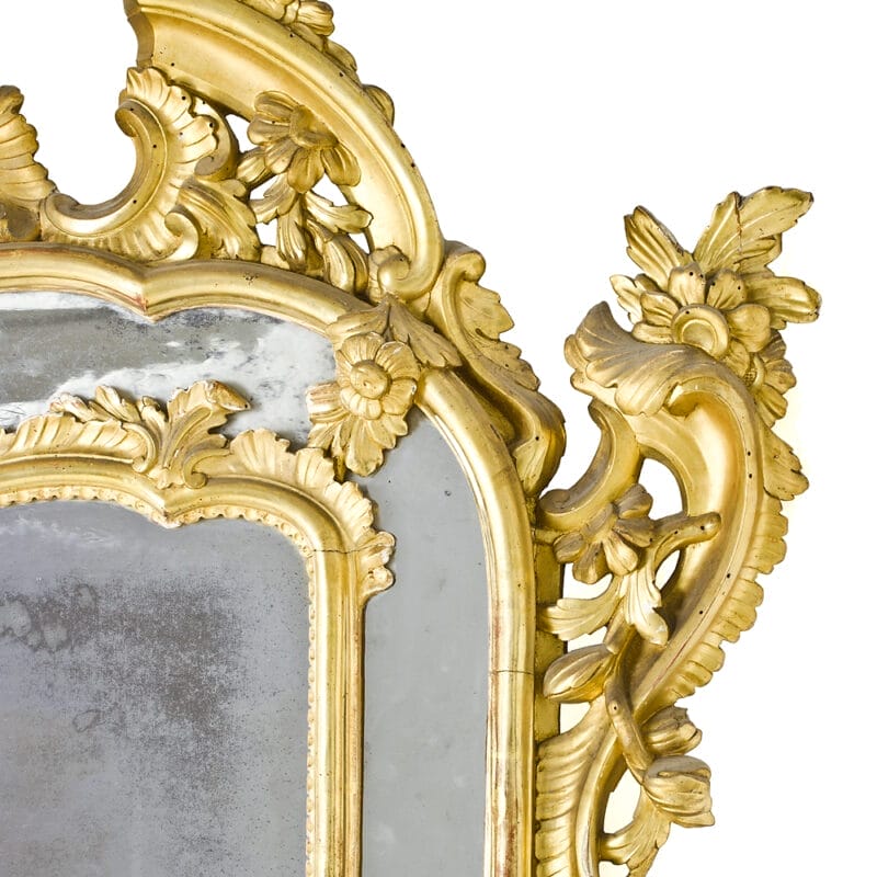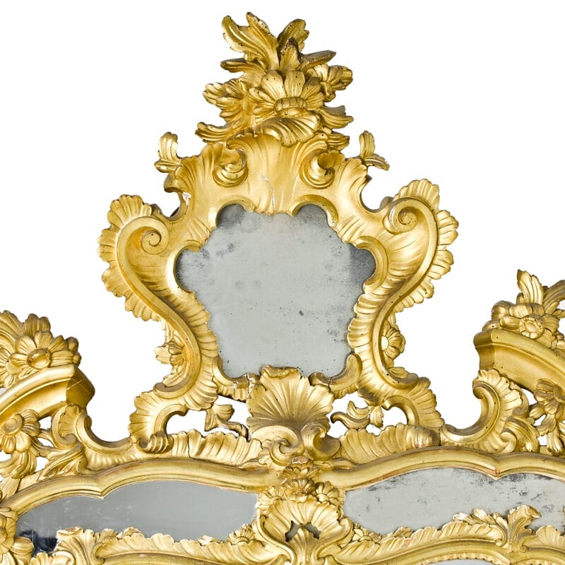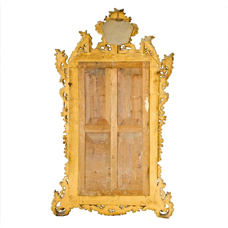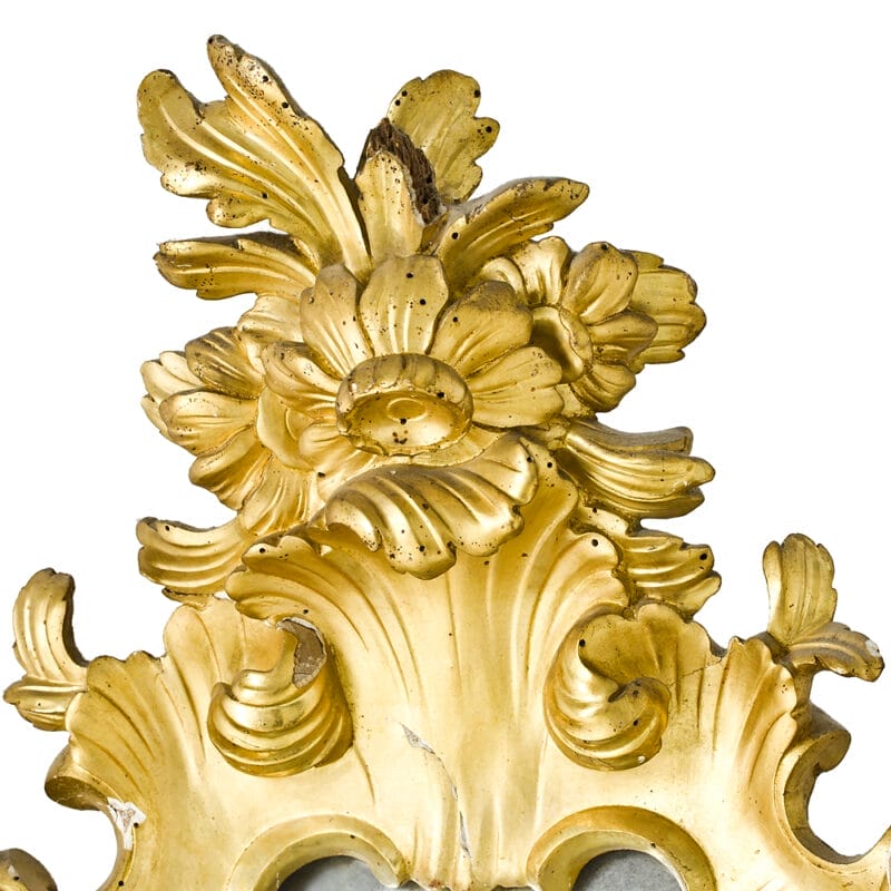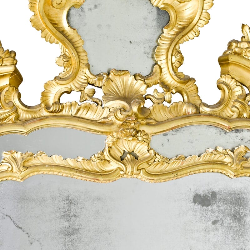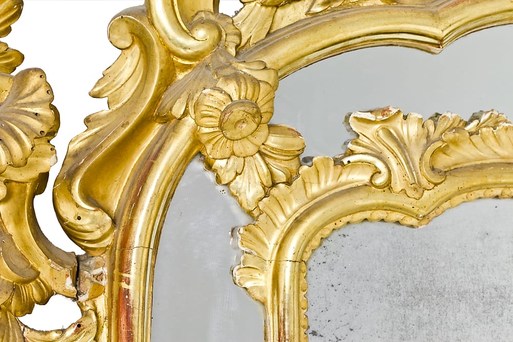 Specchiera Luigi XV in legno dorato e piano in marmo giallo di Siena, di epoca Luigi XV della metà del Settecento e provenienza napoletana.