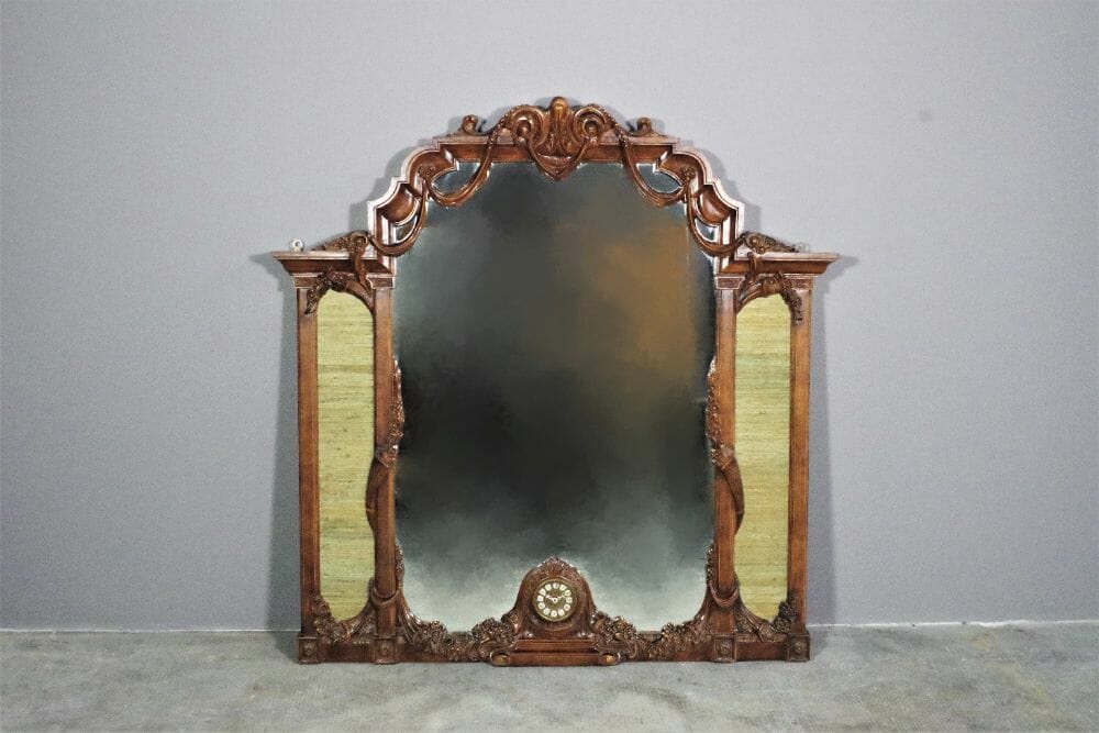 Specchio con cornice in legno intagliata , con tessuto verde e orologio con piccola anta in vetro e ottone anni ‘60.