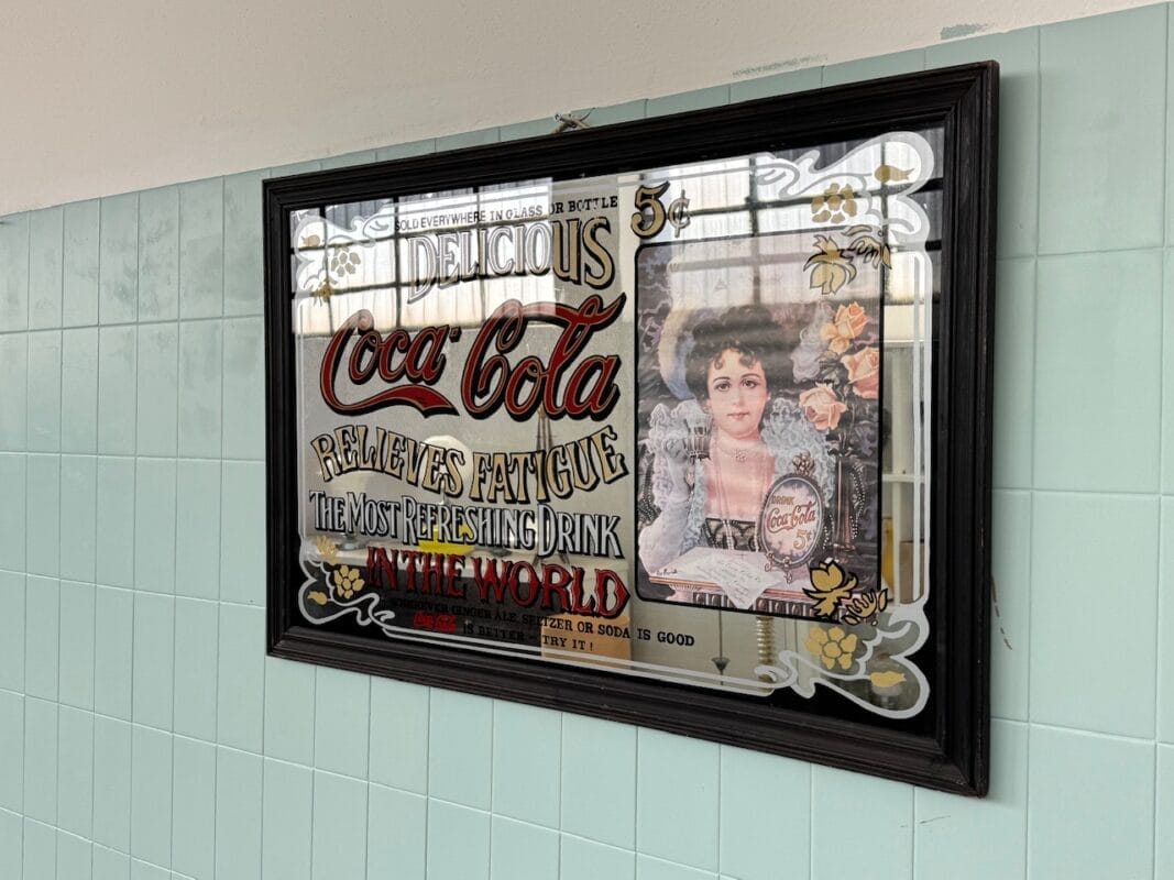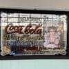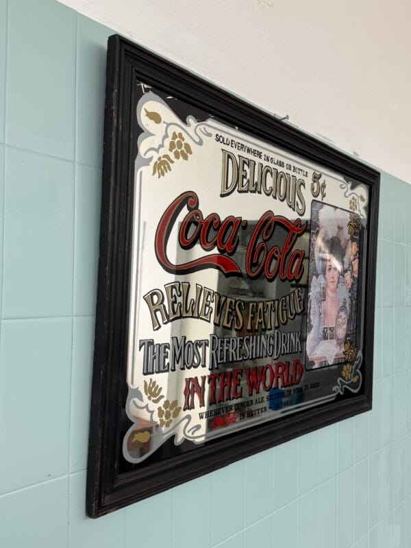 Specchio pubblicitario vintage della Coca-Cola con vetro incorniciato di grandi dimensioni.